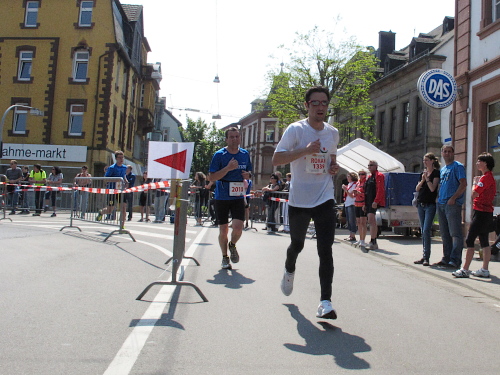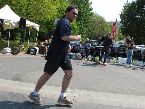 Musikalisch lässt der Marathon hier nicht nach. Es ist alles geboten. Ein Solist improvisiert spontan und singt mir sogar ein ganz persönliches Läuferlied, während auf der Gegenbahn jetzt langsam die Marathonis auftauchen, die so meiner Leistungsklasse entsprechen. Letzter Anstieg, die Aufmunterung des Sprechers gilt jetzt mir. Fetzige Rockmusik, wieder die Cheerleader, Gekreische, dann links hinunter. Aufpassen, dass ich nicht abhebe. Die Leute sind verrückt. Und das geht so bis zum Schluss. Ich kriege mit, dass die Glocken der Evangelischen Kirche geläutet werden, als deren Staffel ins Ziel läuft. Die Sonntagsmesse dauerte genau 42 Minuten. Habt Ihr sowas schon mal erlebt?