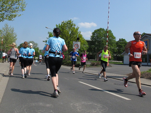 Ich knipse das 22KM-Schild - Mensch bin ich gut drauf! Die Coverband in der Werkstraße ist bei „R“ und den Rolling Stones (Jumping Jack Flash) und hat das Alphabet bald durch. Nach der ersten Wende ist die Hektik raus, dafür haben die 3-Stunden-Marathonis jetzt etwas Mühe, im Rhythmus zu bleiben. Ich merke schon, es allen recht zu machen, wird auch heute wieder nicht gelingen. Ausgangs der Werkstraße an der ersten Getränkestelle dann das Übliche: Gestresstes Personal und knappes Angebot am ersten Tisch, entspannte Leute und große Auswahl am letzten. Wenn ich mich recht erinnere, habe ich das gleich bei meiner ersten Teilnahme kapiert.