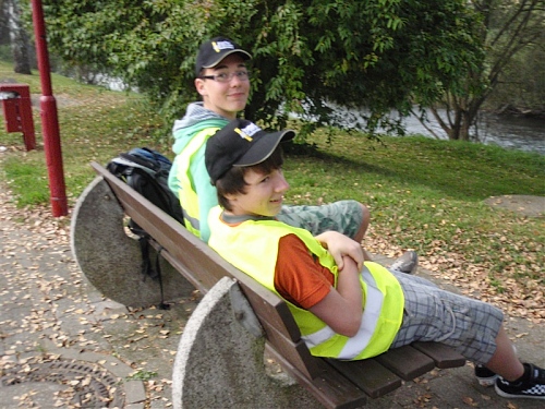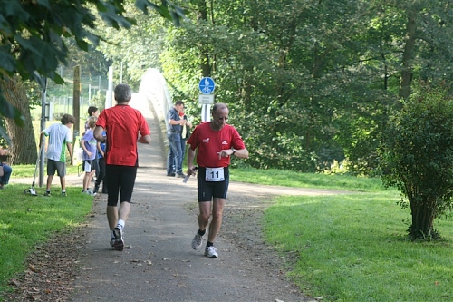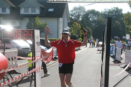 Dann überholt mich auch noch Dirk. Während ich noch drei Runden vor mir habe, ist er bereits vier Kilometer vor dem Ziel. Respekt für sein Höllentempo bei diesen hohen Temperaturen. Ich lasse mich aber nicht aus meinem Rhythmus reißen und versuche gar nicht erst, mich noch einmal dran zu hängen. Dafür genieße ich es, daß mir Dirk nach seinem Zieldurchlauf Wasser und Tee freundlich entgegen streckt. Der Hinweis, daß er auf mich warten wird beschleunigt noch einmal mein Tempo, schließlich möchte ich ihn nicht zulange warten lassen. Ebenso wie Silke, die mich nach 3:47 Stunden freudestrahlend ablichtet. Selten war ich so froh, das Ziel erreicht zu haben. Unter diesen Bedingungen dauerte es auch etwas länger, mich zu erholen. Während wir uns schon ausruhen dürfen, werden wir von Peer bereits beglückwünscht bevor er sich wie immer lächelnd auf seine letzte Runde begibt. Er hat heute sicher das vernünftigere Tempo gewählt.