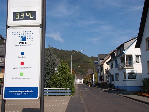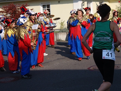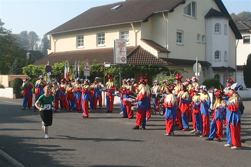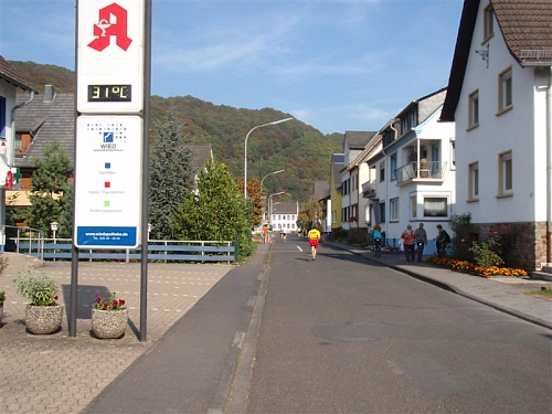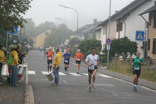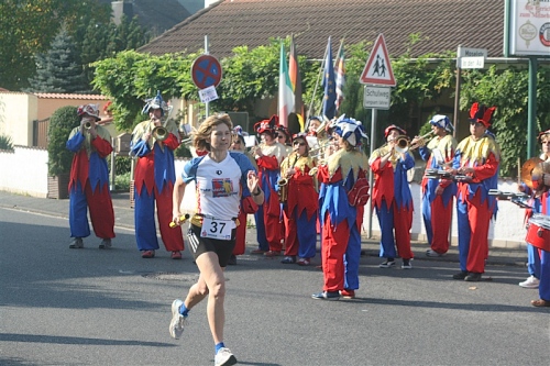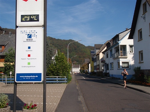 Was soll’s, die hier aufgewendeten Körnern werden durch die aufmunternden Worte Wolfgangs am Kommentatorenplatz für mich, wie für alle übrigen Teilnehmer ersetzt. Selbst Klaus Klein hat von Runde zu Runde anerkennende Worte für mein Aussehen. Ich wusste gar nicht, daß ich so gut schauspielern kann, denn die Beine werden immer schwerer. Die Verpflegungsstelle wird jetzt regelmäßig gerne genutzt. Die Guggenmusik unterhält die Teilnehmer mit einer flotten Version von „Über den Wolken“. Der Rhythmus passt längst nicht mehr zu meinem Lauftempo. Auf den letzten 7 Runden schweift mein Blick immer wieder auf die Temperaturanzeige bei der Apotheke in der Kolpingstraße. Unerbittlich steigt das Thermometer um ein bis zwei Grad pro Runde, um schließlich Schwindel erregende 33 Grad zu erreichen. Muß denn der Sommer 2011 unbedingt heute auf einen Schlag nachgeholt werden?