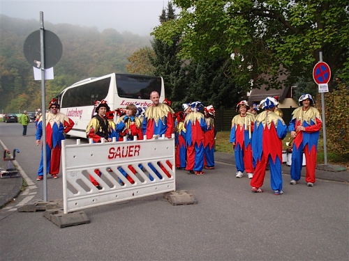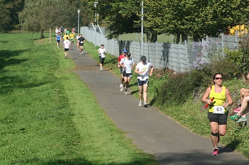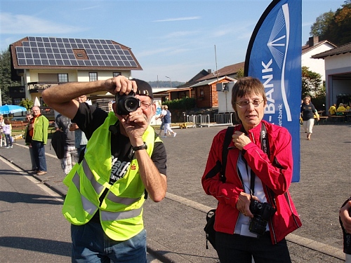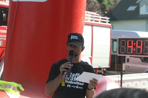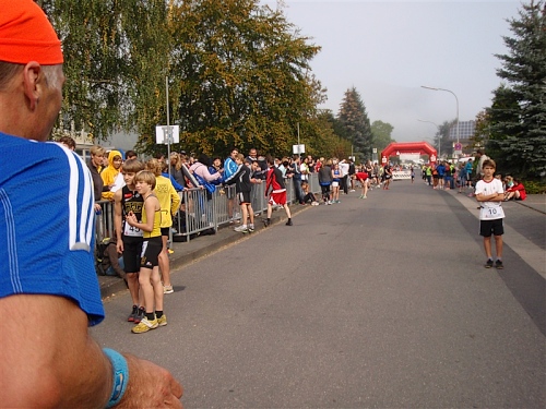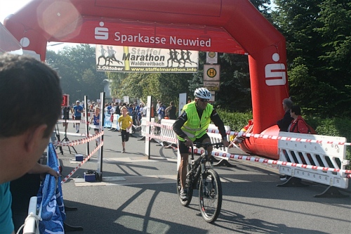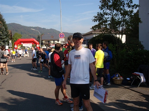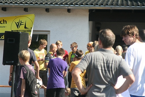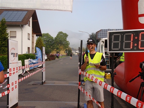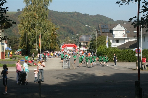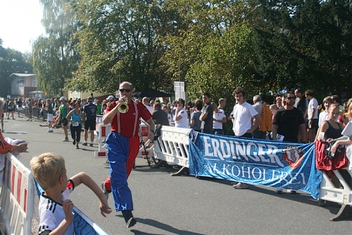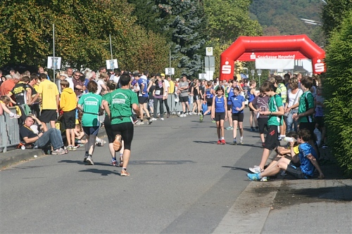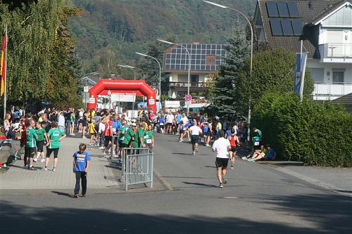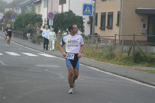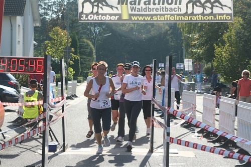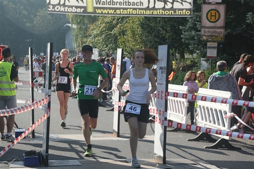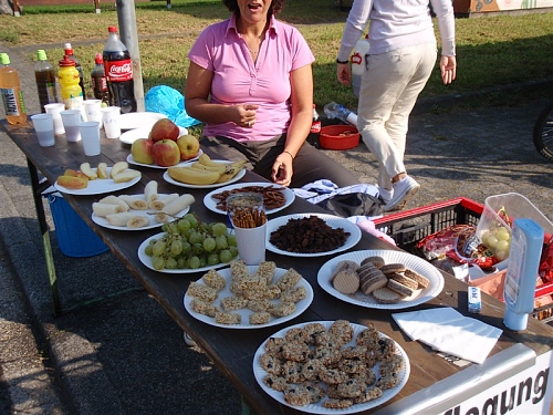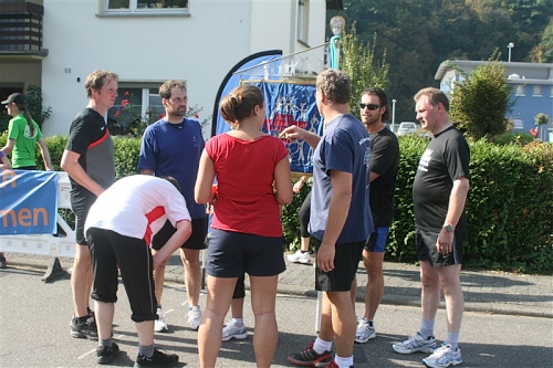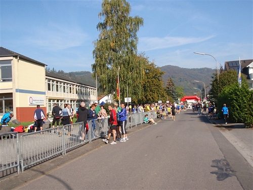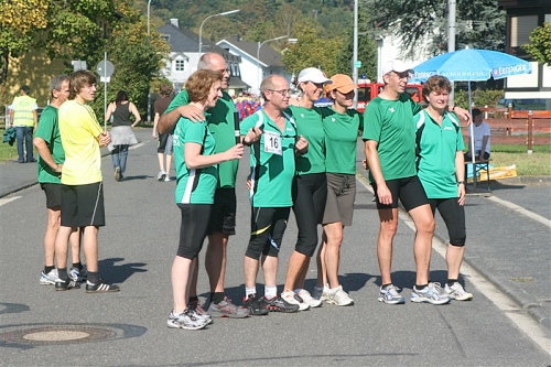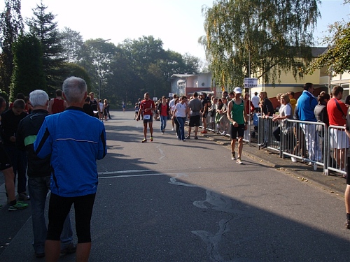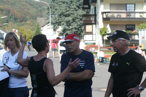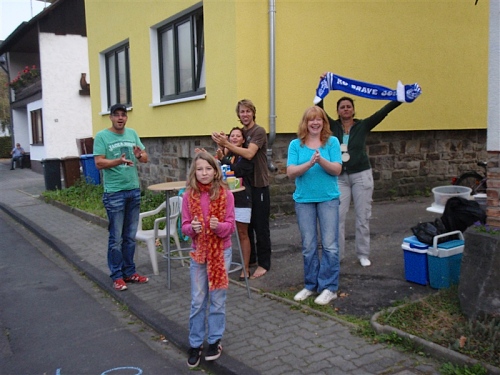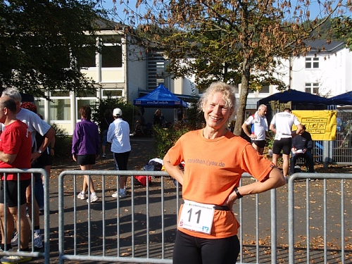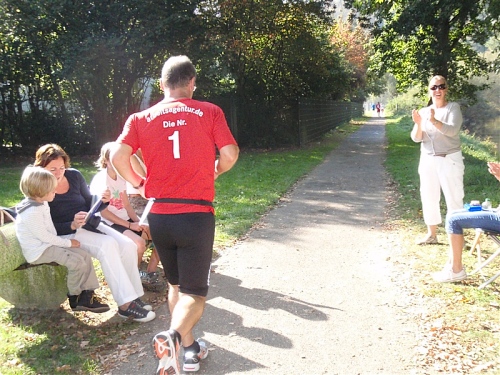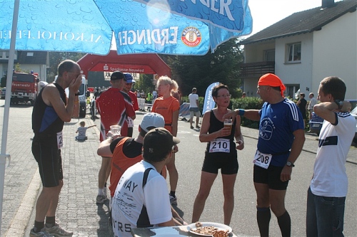Der strahlende Sonnenschein lässt uns die Zeit bis zur Siegerehrung in vollen Zügen genießen, die vor der dem Schulhof gegenüberliegenden Feuerwehr stattfindet,kürzeste Wege für uns also. Diese ist übrigens in die Organisation mit eingebunden und stellt nicht nur die Streckensicherung und den Platz zur Verfügung, sondern übernimmt auch einen Großteil der Bewirtung. Auch die nach uns einlaufenden Staffeln und Einzelstarter werden noch standesgemäß begrüßt. Die Gelegenheit für einen weiteren Plausch mit Eberhard, Angelika, Klaus, Dirk, Peer und und und wird nicht ungenutzt gelassen. So können Silke und ich nach Abschluß der Veranstaltung um eine wunderschöne Marathonerfahrung bereichert erschöpft, aber mehr als zufrieden den Heimweg antreten.