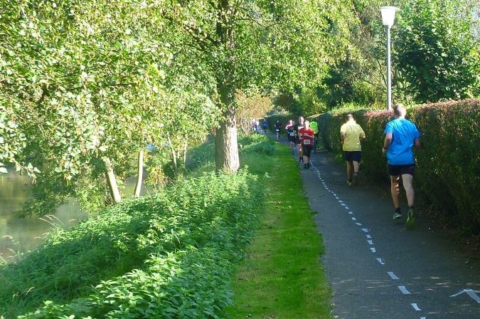 Es stehen keine Zuschauermassen an der Strecke, der Lauf ist dennoch stimmungsvoll. Wir laufen nun an der Wied entlang zurück zum Wechselgelände am Schulzentrum. Schön, so an der Wied zu laufen. Auf den 200m mit Gegenverkehr ist es etwas eng, aber mit gegenseitiger Rücksicht klappt das auch.