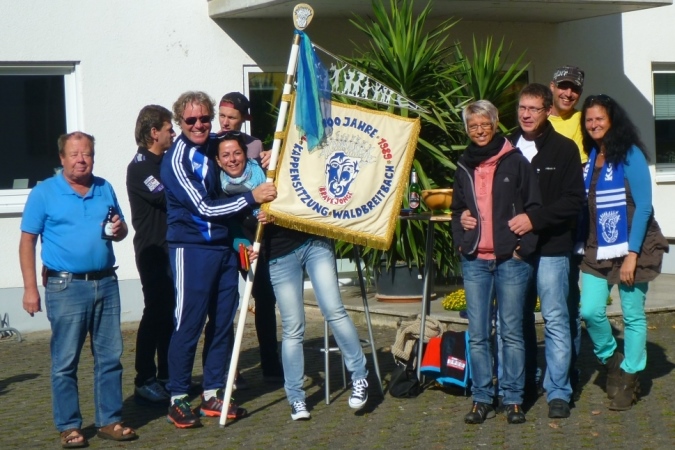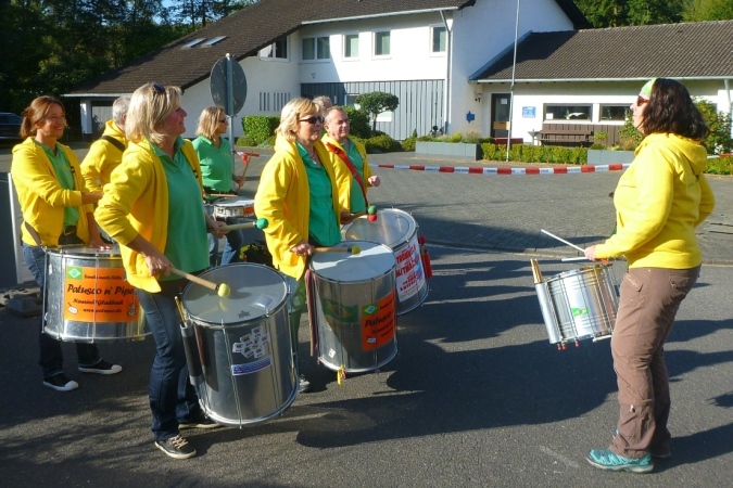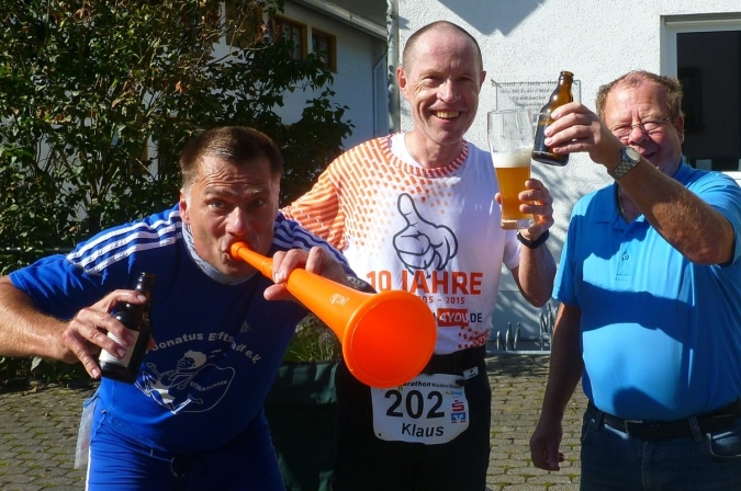 Und noch einer ist mir eine große Stütze. Mein Kumpel Dirk ist mit zwei Staffeln der LG Donatus dabei. In einer seiner Laufpausen dreht er eine Runde mit mir. Bei Sepp bleiben wir natürlich hängen. Dirk hat eine dicke Tröte dabei und trötet unterwegs was das Zeug hält.