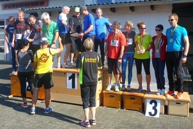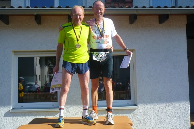 Ein wirklich schöner Lauf ist zu Ende. Ab in die Dusche in der Sporthalle. Nun heißt es Kuchen fassen und das Flüssigkeitsdefizit bekämpfen. Und ich muss aufs Treppchen. Auf die niedrige Stufe des Drittplatzierten komme ich ja noch recht problemlos. Aber als der Sieger Fritz Waddey mich zu sich bittet für ein Foto, muss ich koordinativ schon eine Höchstleistung aufbringen.