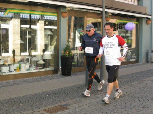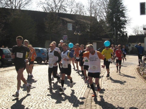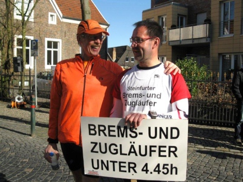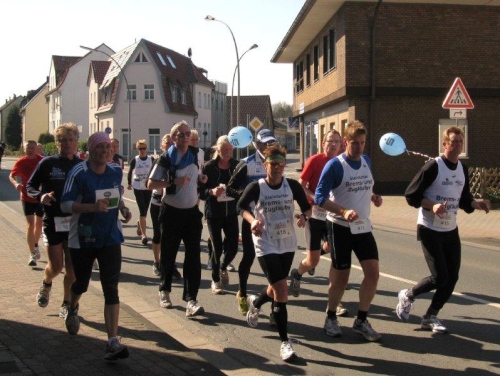 Allmählich finden sich die Läufer ein und schon bald erscheinen die großen Schilder mit den Zeiten der Brems- und Zugläufer. In Steinfurt kam man schon 1984 auf die Idee, den Läufern hier eine Orientierungshilfe zu geben. Damals waren die Sportuhren noch selten, mit denen man die Zwischenzeiten festhalten konnte und damit eine solide Tempokontrolle hatte. Doch auch heute läuft es sich immer noch angenehmer in einer Gruppe, die das gleiche Zeitziel hat und von erfahrenen Läufern geführt wird. Hier in Steinfurt hat man dieses System perfektioniert und die Brems- und Zugläufer werden sogar gerne zu auswärtigen Läufen eingeladen. Neun Gruppen für die Zeiten von 2:59 bis 4:59 werden im 15 Minutentakt angeboten.
