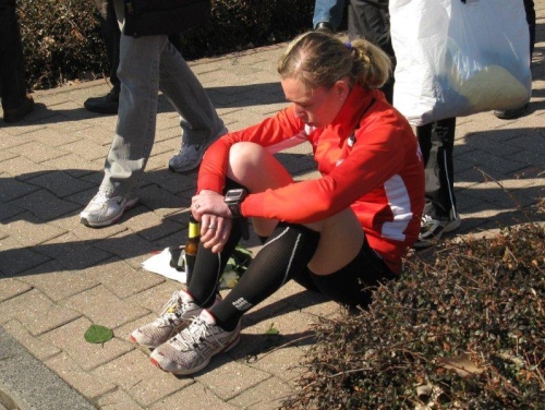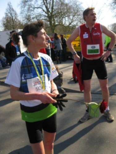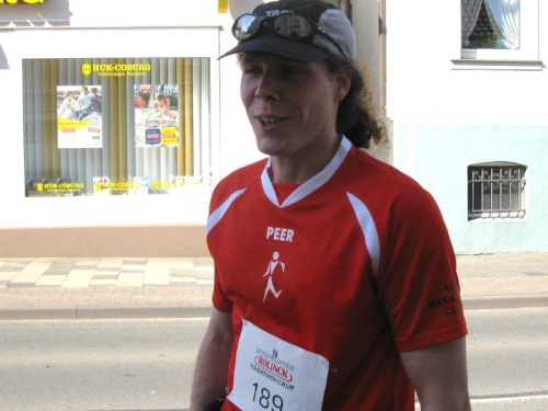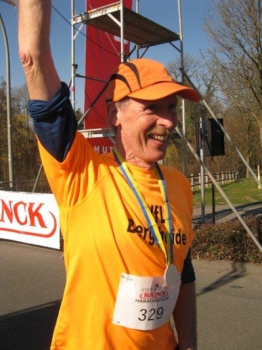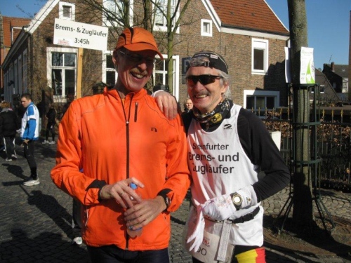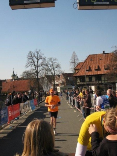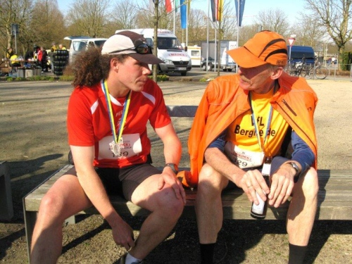 Über das Kopfsteinpflaster des Marktplatzes laufen wir direkt Richtung Ziel. Der Beifall wird immer stärker und meine Beine wieder leichter. Vor mir sehe ich schon das Zielbanner und nach 4:12:31 bin ich über die Erfassungsmatte gelaufen. Ich erhalte eine schöne Medaille und ein Teilnehmershirt. Inge kommt zu mir gelaufen und hat schon eine Flasche alkoholfreies Bier vom Sponsor Rolinck organisiert. Da sie mir auch meine warme Jacke mitgebracht hat, kann ich mich erst einmal in Ruhe in der Sonne erholen. Christiane hat noch Peer getroffen und wir gratulieren uns gegenseitig zum erfolgreichen Finish. Peer ist erst gestern aus Neuseeland zurückgekommen und kämpft noch etwas mit dem Jetlag.
