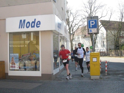 Nach weiteren 2 km erreichen wir Borghorst und hier am Fleigenweg müssen wir auf einem kurzen Stück bereits 15 m der insgesamt 64 Höhenmeter bewältigen. Da hier etliche Zuschauer stehen, gelingt dies auch mit einem Lächeln. Wir durchlaufen nun mit einigen Kurven Borghorst bevor wir am Marktplatz auf eine größere Zuschauermenge treffen. Hier wird mit Musik und Beifall kurz Citymarathonstimmung erzeugt und der Sprecher klärt die Zuschauer über die Teilnehmer auf. Ich werde als m4y-Berichterstatter vorgestellt. „Da schauen wir doch täglich rein“ meint er und bestellt noch einen schönen Gruß an den Chefredakteur.