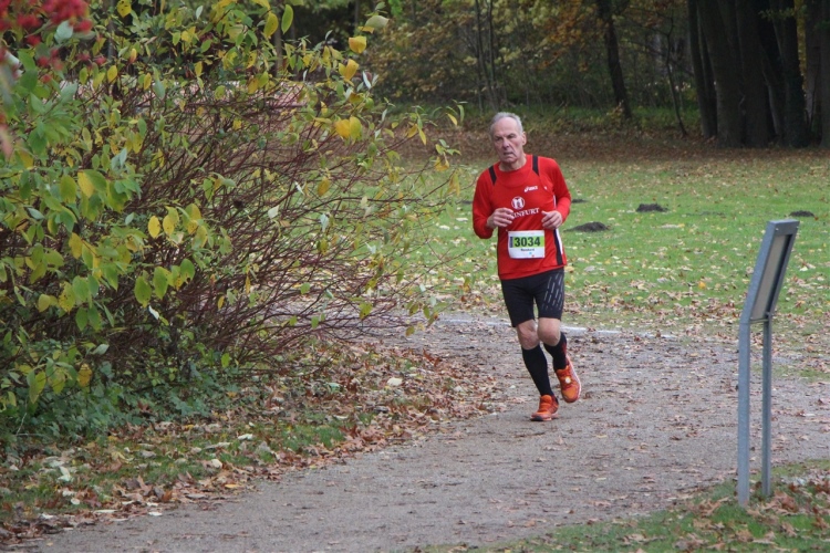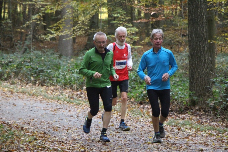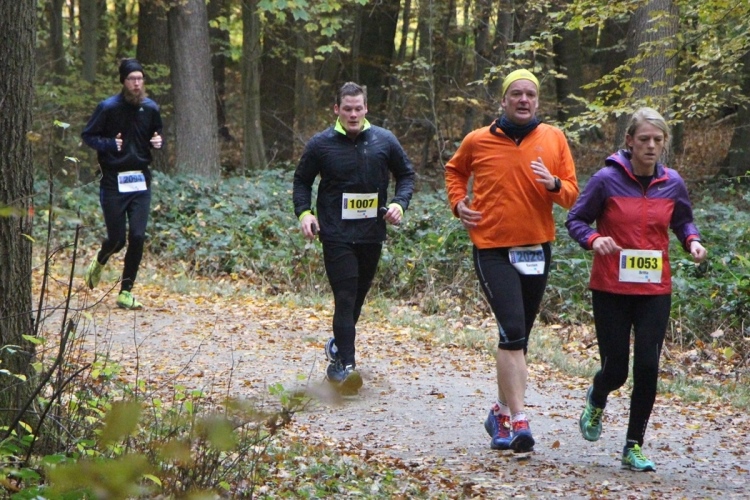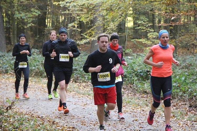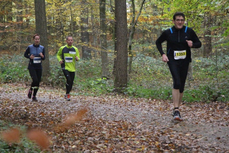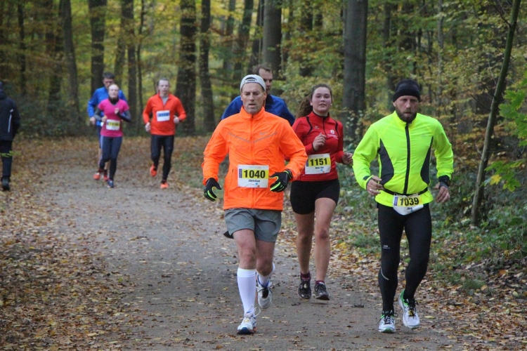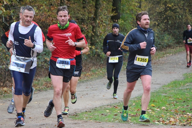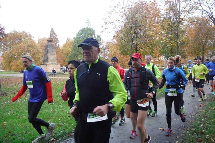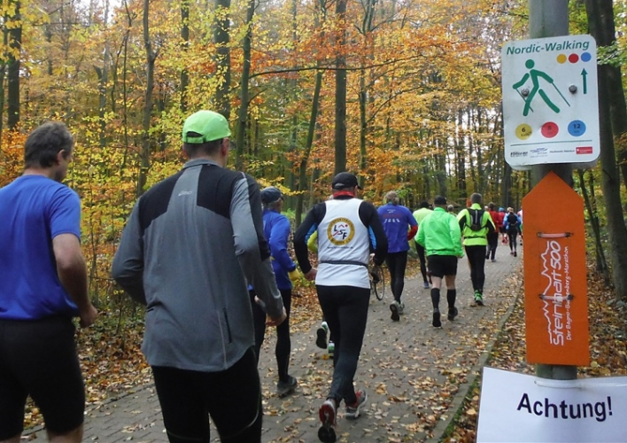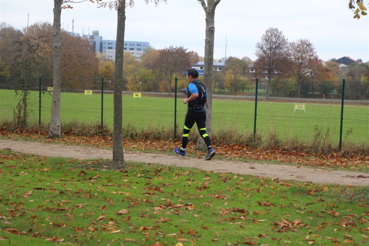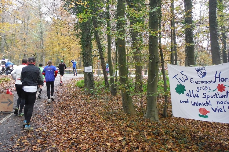 Vorbei geht es am Denkmal für die Gefallenen der Weltkriege, um anschließend nach rechts in den Wald einzutauchen. Auch wenn es die Sonne heute schwer hat, die Wolken zu durchbrechen, leuchten die Blätter in grün, gelb und rot. Die Helfer sind auf dem Posten und weisen uns den richtigen Weg. Dies bleibt auch so, so daß Verlaufen ausgeschlossen ist. Nach einem kurzen Schwenk nach Westen knickt die Strecke erst in Richtung Süden und dann nach Südosten ab. Es folgt eine lange Gerade, die uns nach knapp 3 KM unter der B 54 hindurch führt. Bernd schließt zu mir auf, ich bin wieder einmal als Reporter aufgefallen. Als früherer Organisator der Brems- und Zugläufer plaudert er aus dem Nähkästchen und bringt mir die Geschichte der Steinfurter Marathongeschichte näher.