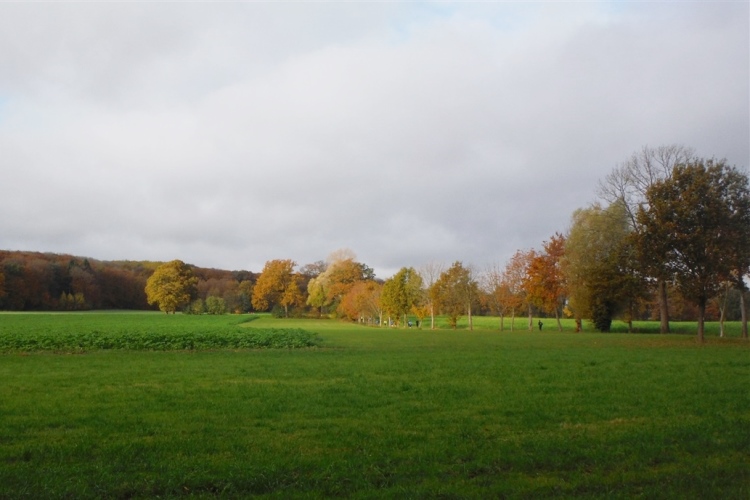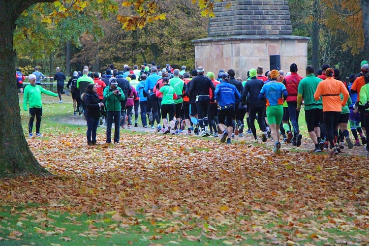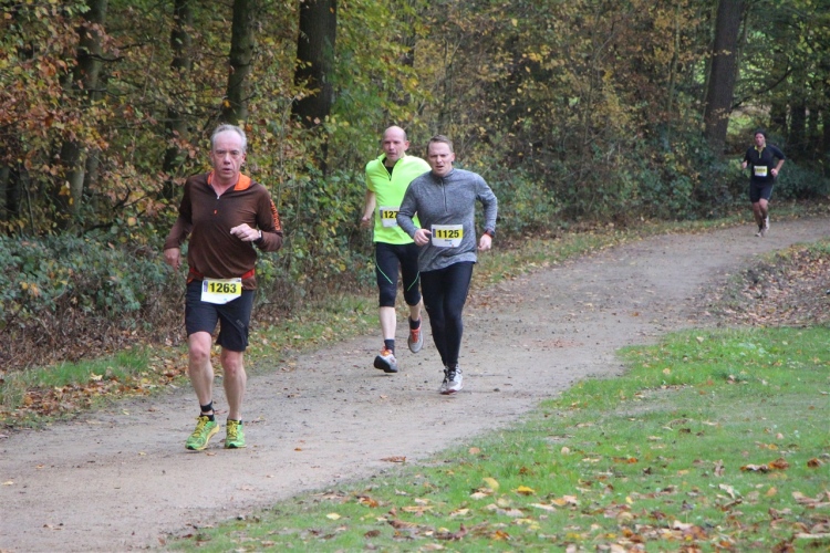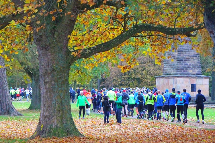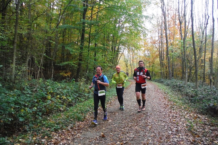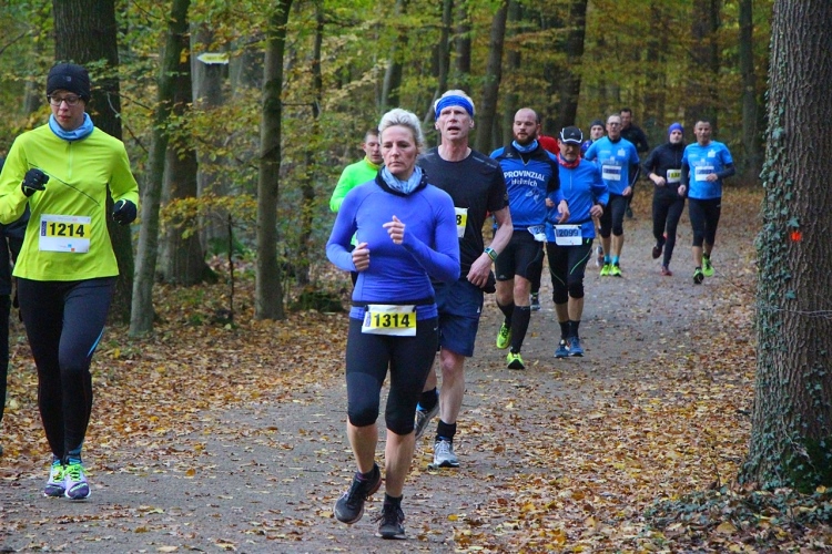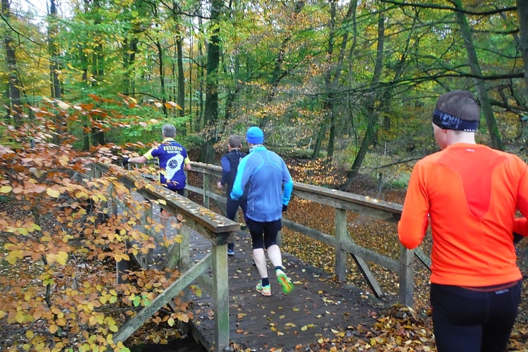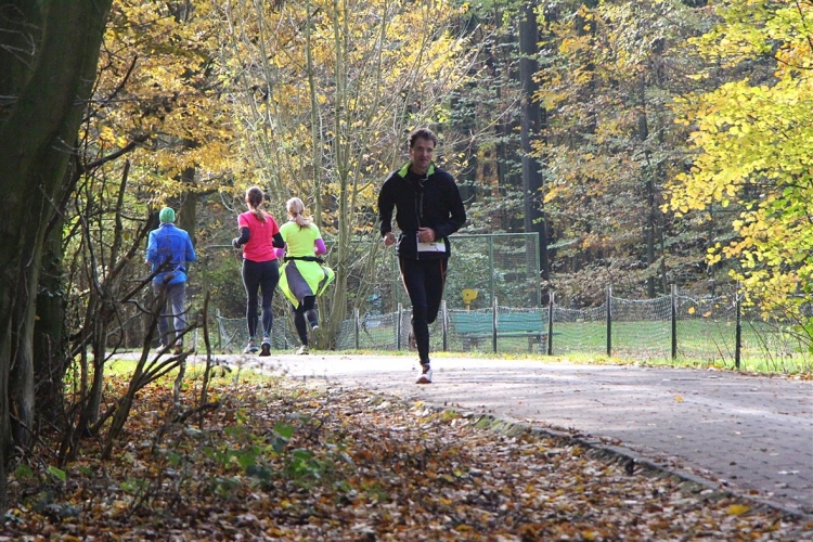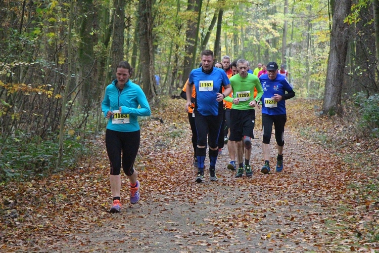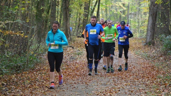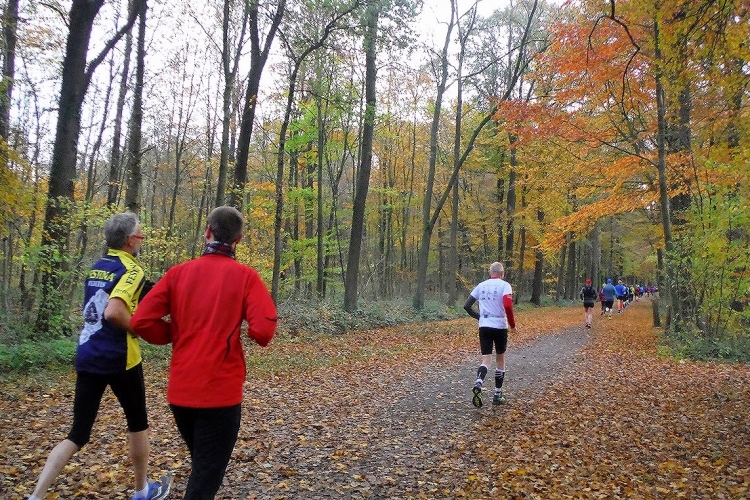 Vorbei geht es am Denkmal für die Gefallenen der Weltkriege, um anschließend nach rechts in den Wald einzutauchen. Auch wenn es die Sonne heute schwer hat, die Wolken zu durchbrechen, leuchten die Blätter in grün, gelb und rot. Die Helfer sind auf dem Posten und weisen uns den richtigen Weg. Dies bleibt auch so, so daß Verlaufen ausgeschlossen ist. Nach einem kurzen Schwenk nach Westen knickt die Strecke erst in Richtung Süden und dann nach Südosten ab. Es folgt eine lange Gerade, die uns nach knapp 3 KM unter der B 54 hindurch führt. Bernd schließt zu mir auf, ich bin wieder einmal als Reporter aufgefallen. Als früherer Organisator der Brems- und Zugläufer plaudert er aus dem Nähkästchen und bringt mir die Geschichte der Steinfurter Marathongeschichte näher.
