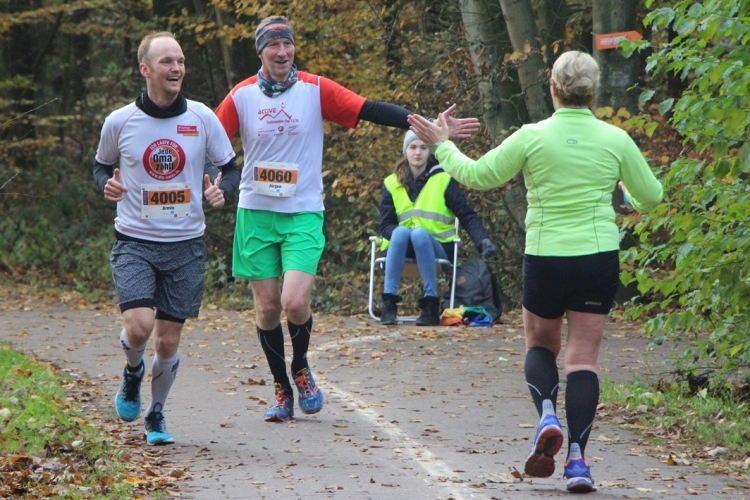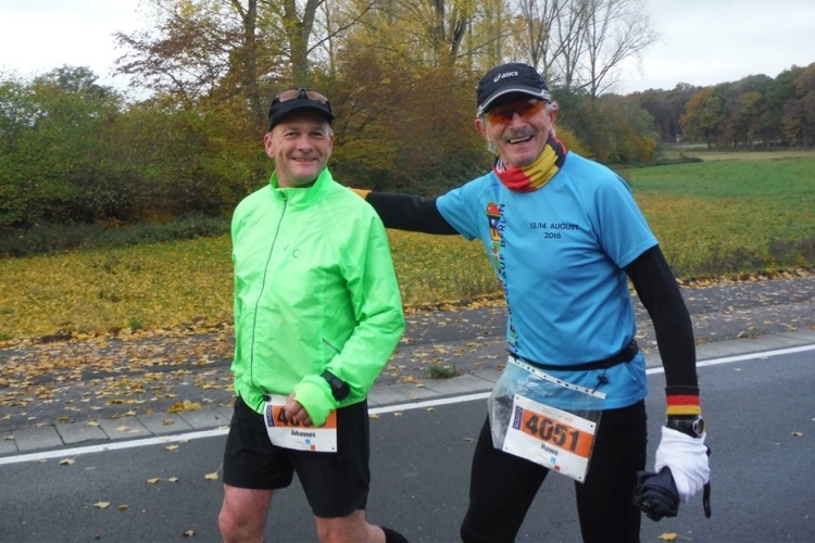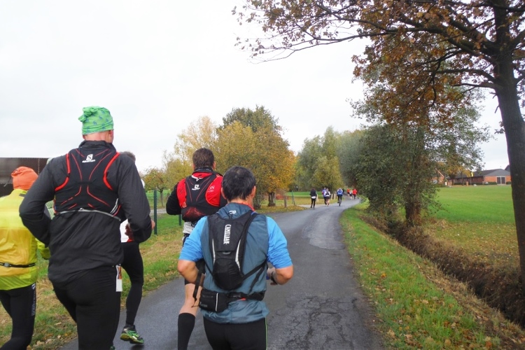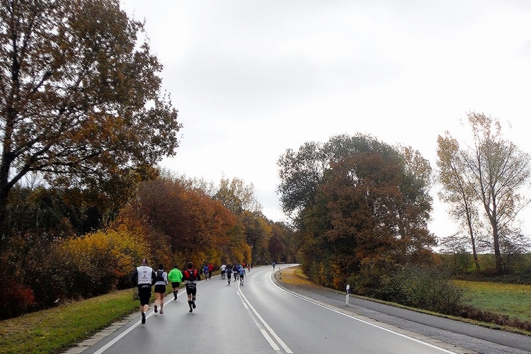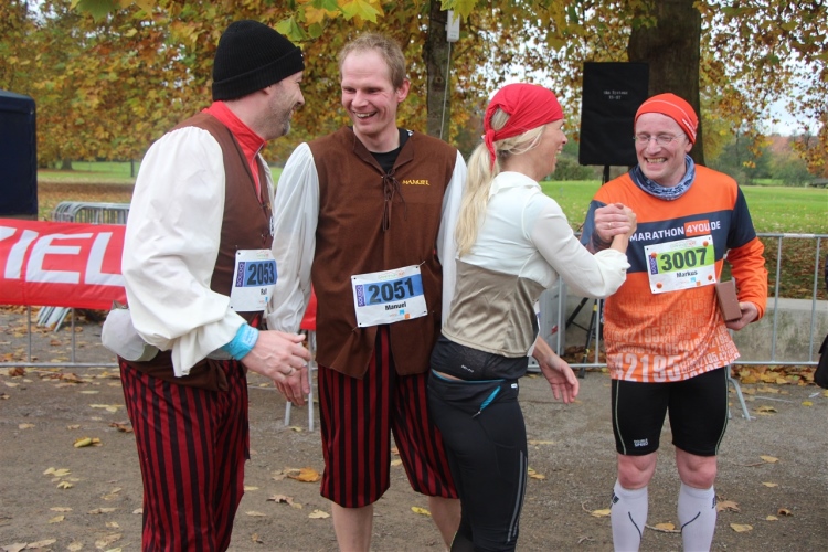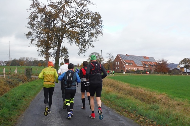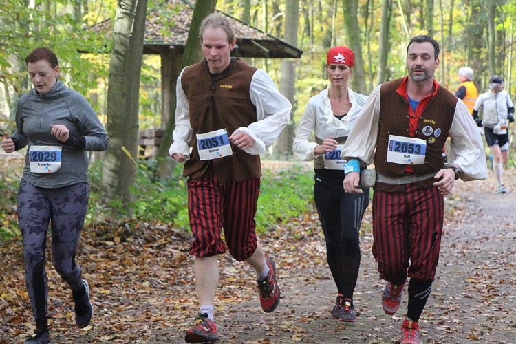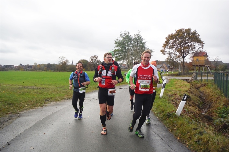 Als ich auf das Begegnungsstück zur Landstraße abbiege, ist es mit meiner Ruhe erst mal vorbei. Die Läufer der kürzeren Strecken über 14 und 28 Kilometer kommen mir entgegen. Sie sind einige Zeit nach uns auf die Strecke gegangen. Das Gedränge ist groß genug, um höchste Konzentration zu fordern. Gut so, denn sonst wären die mir bekannten Paderpiraten mit Ralle womöglich entgangen. In ihrem Piratenkostüm fallen sie bei jedem ihrer Läufe auf. Das ist gewollt, denn sie sammeln Spenden für Kinderprojekte im Paderborner Land. Ich freue mich immer wieder, diese engagierte Truppe zu treffen. Aber ihren Vorsprung werde ich wohl kaum aufholen.