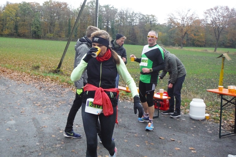 Verpflegungspunkte an der Strecke und Verpflegung im Ziel. Gereicht werden Tee Wasser und teilweise Cola, dazu Apfelstücke und Rosinenstuten.