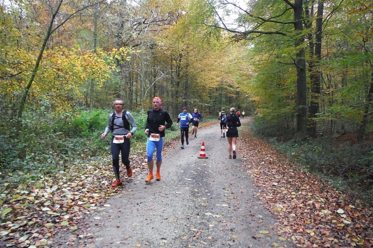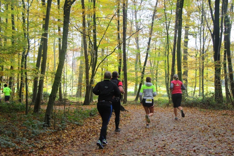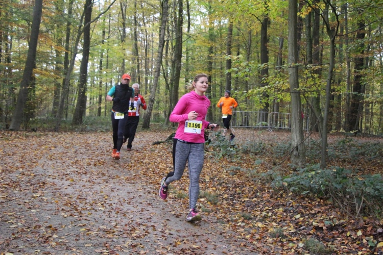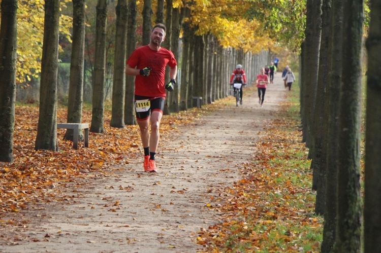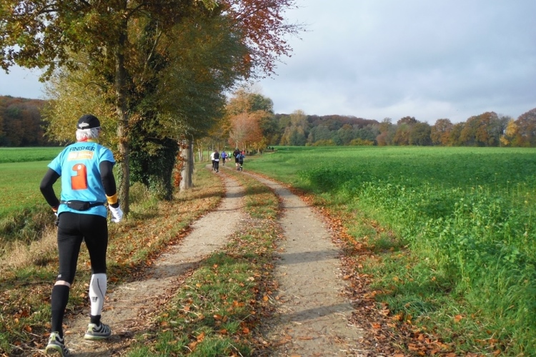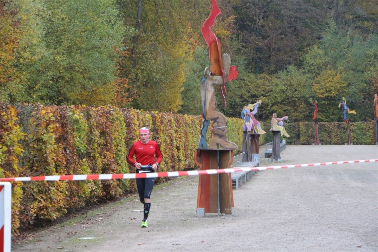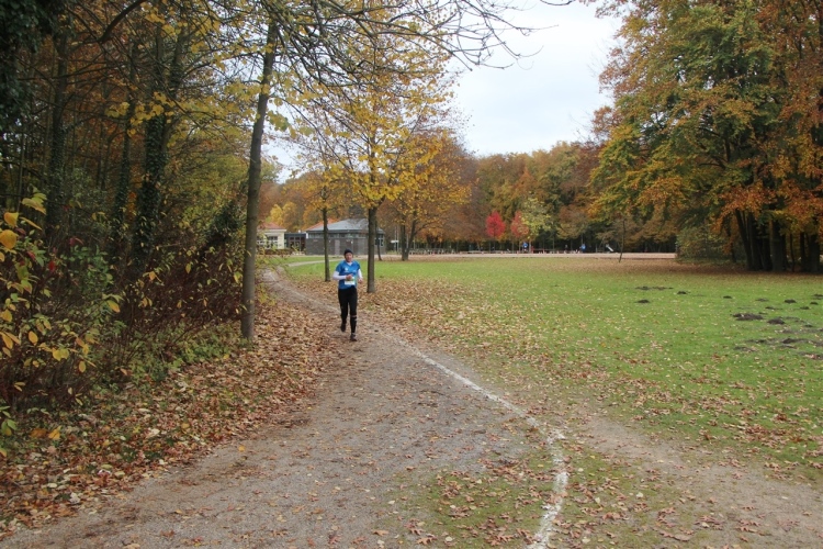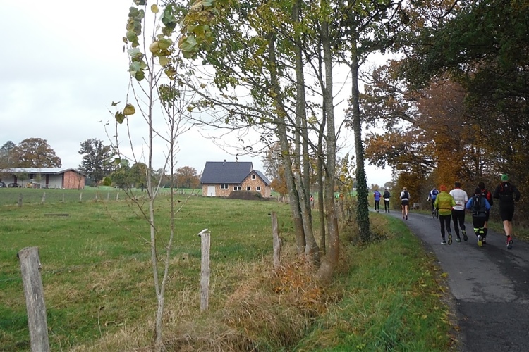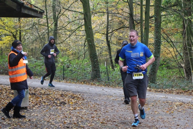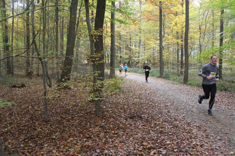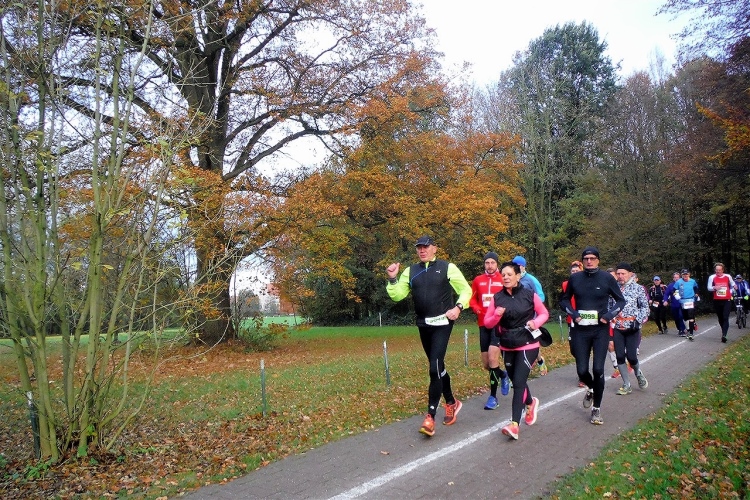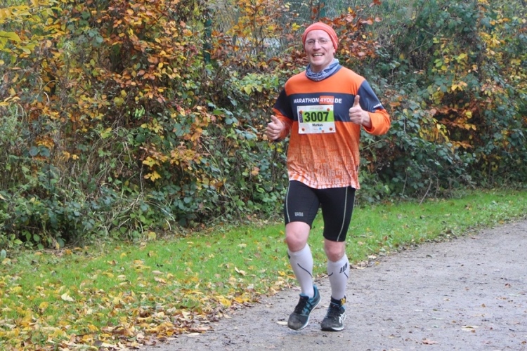 Die Zwischenzeit deutet auf eine Endzeit von 4:30 Stunden hin. Ich fühle mich gut und laufe entsprechend motiviert auf die 2. Runde. Ralf läßt mich ziehen. Das Teilnehmerfeld ist jetzt soweit auseinandergezogen, das ich nur noch wenige Läuferinnen und Läufer im Blick habe. Von hinten kommt derzeit wenig, die Vorderleute spornen mich an. Der herbstliche Wald wirkt beruhigend, rechts fließt die Steinfurter Aa gemächlich dahin. Ich finde die notwendige Balance, um nicht läuferisch zu überdrehen. In gleichmäßigem Tempo lasse ich mich die nächsten Kilometer treiben.