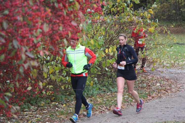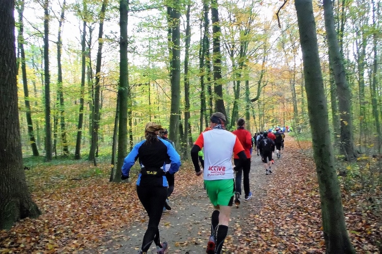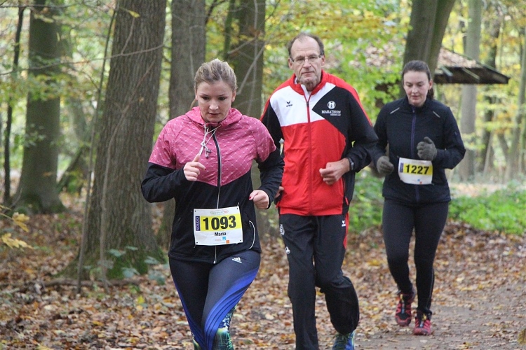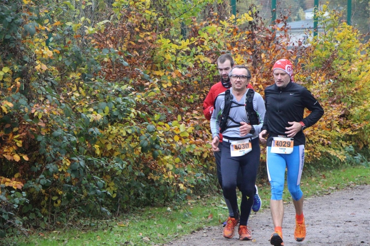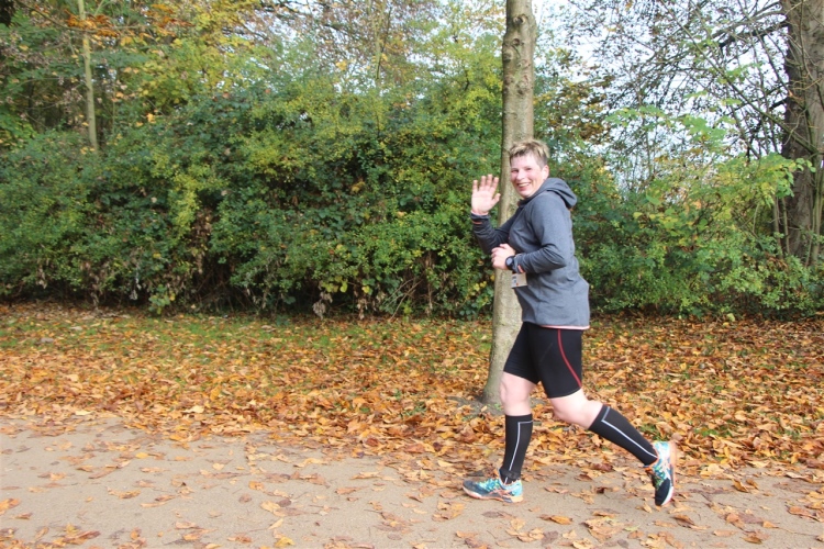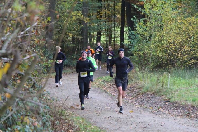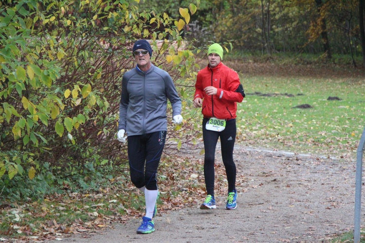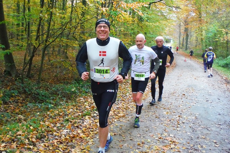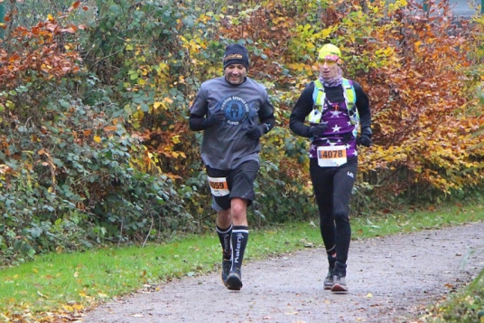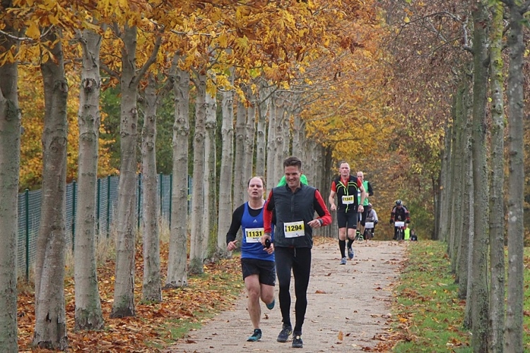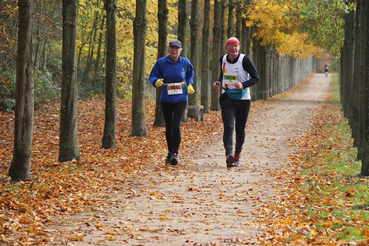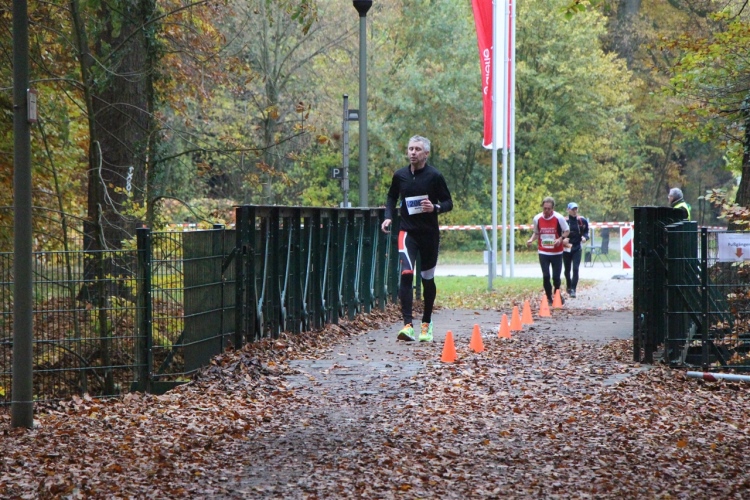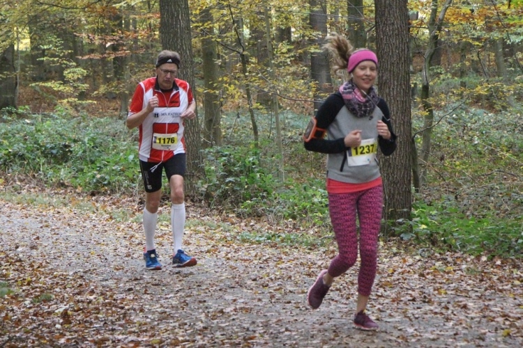 Die Zwischenzeit deutet auf eine Endzeit von 4:30 Stunden hin. Ich fühle mich gut und laufe entsprechend motiviert auf die 2. Runde. Ralf läßt mich ziehen. Das Teilnehmerfeld ist jetzt soweit auseinandergezogen, das ich nur noch wenige Läuferinnen und Läufer im Blick habe. Von hinten kommt derzeit wenig, die Vorderleute spornen mich an. Der herbstliche Wald wirkt beruhigend, rechts fließt die Steinfurter Aa gemächlich dahin. Ich finde die notwendige Balance, um nicht läuferisch zu überdrehen. In gleichmäßigem Tempo lasse ich mich die nächsten Kilometer treiben.