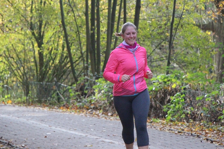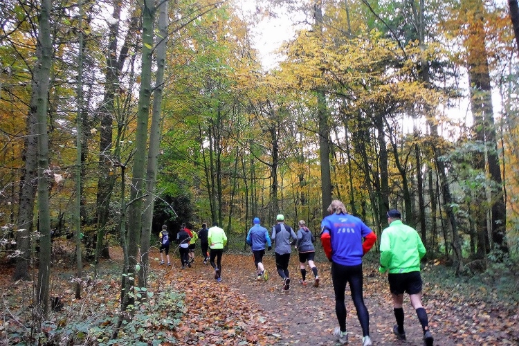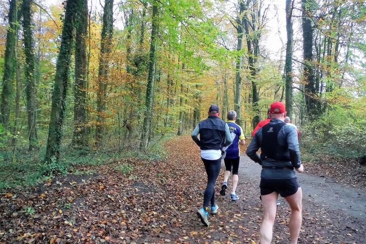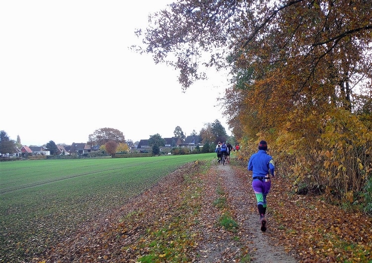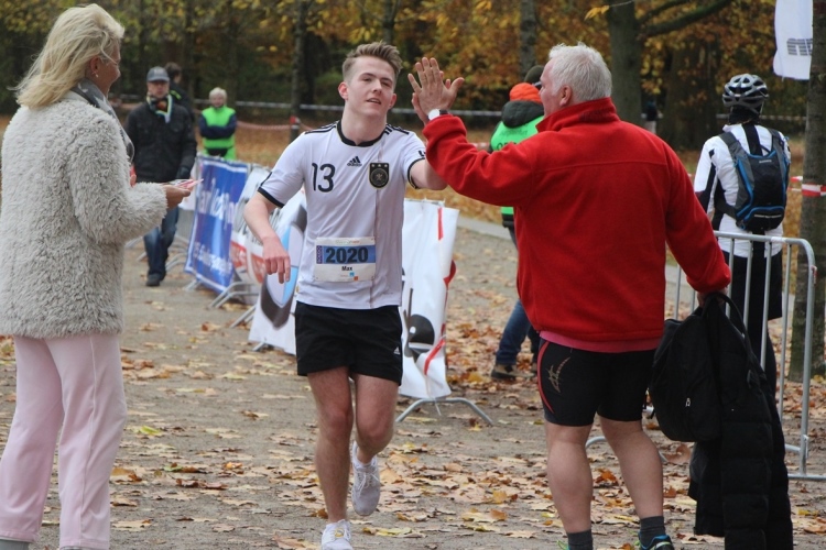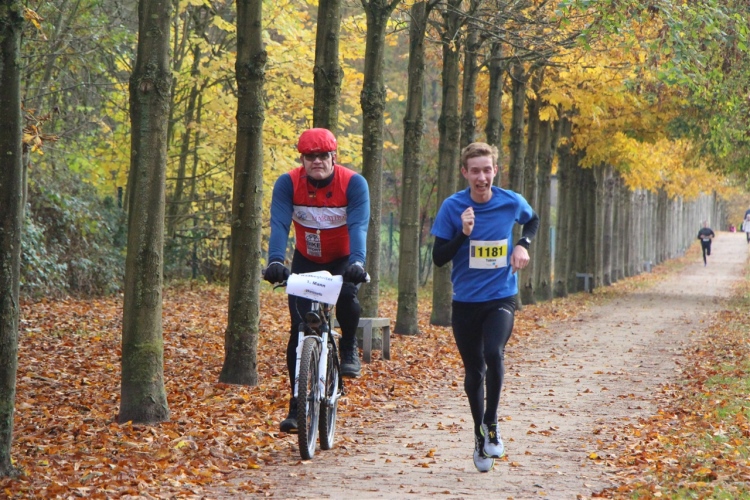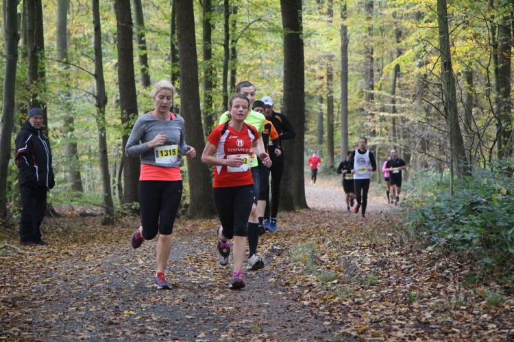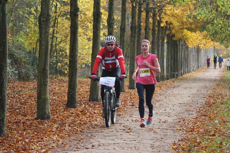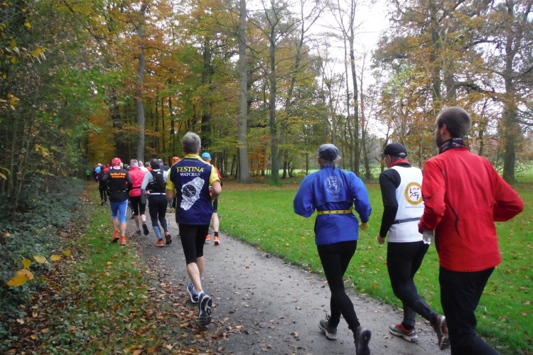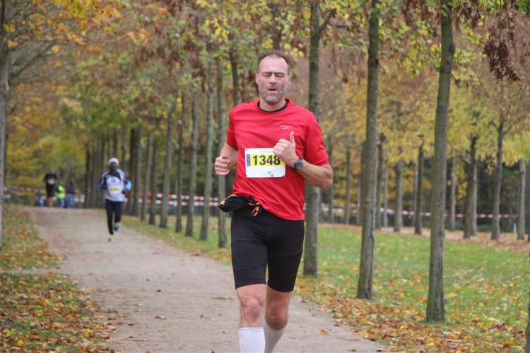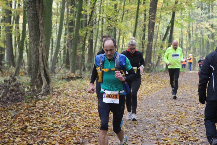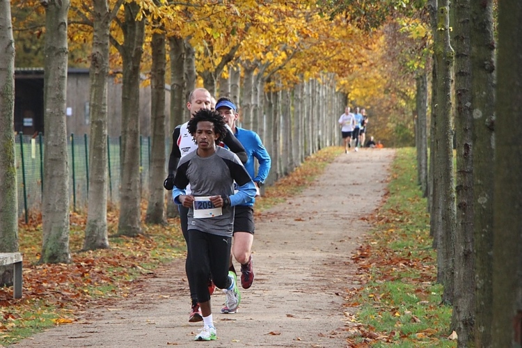 Die Zwischenzeit deutet auf eine Endzeit von 4:30 Stunden hin. Ich fühle mich gut und laufe entsprechend motiviert auf die 2. Runde. Ralf läßt mich ziehen. Das Teilnehmerfeld ist jetzt soweit auseinandergezogen, das ich nur noch wenige Läuferinnen und Läufer im Blick habe. Von hinten kommt derzeit wenig, die Vorderleute spornen mich an. Der herbstliche Wald wirkt beruhigend, rechts fließt die Steinfurter Aa gemächlich dahin. Ich finde die notwendige Balance, um nicht läuferisch zu überdrehen. In gleichmäßigem Tempo lasse ich mich die nächsten Kilometer treiben.