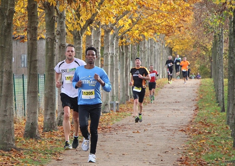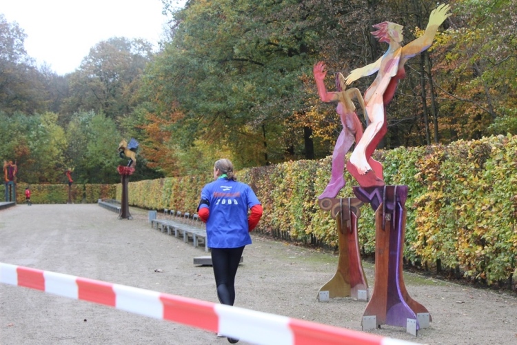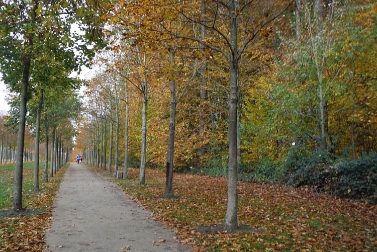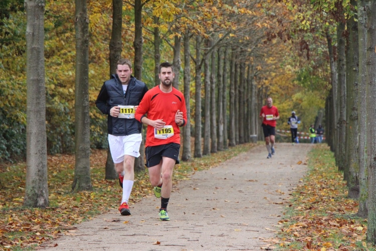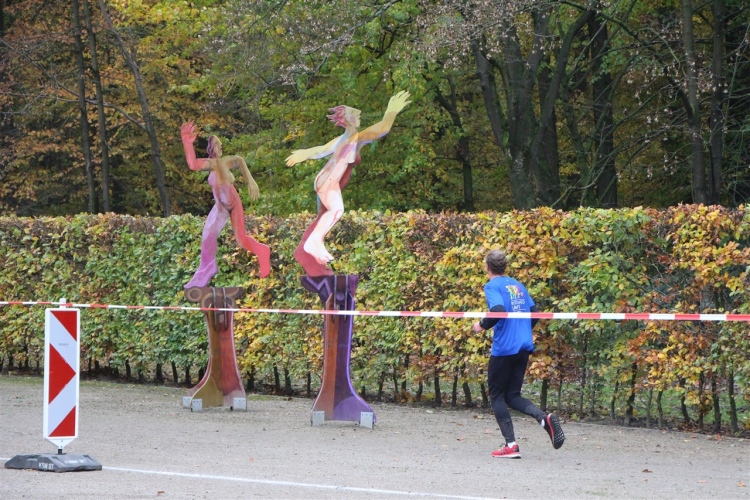 KM 12 ist erreicht. Ich tauche erneut in den Wald ein. Am Ende des Sees überquere ich eine Brücke. Im Bogen führt die Strecke nach rechts. Ein Zaun markiert den Golfplatz, den ich bald quere. Hier kommen mir die Läufer entgegen, die bereits etwa 1,5 Kilometer weiter sind. Der Weg geradeaus würde mich am schnellsten ins Ziel führen. Die netten Helfer weisen mich jedoch nach rechts. Noch läßt mich der Wald nicht los. Ich verlasse ihn erst, als ich kurz darauf die wieder hergestellte Große Allee erreiche. 2003 neu errichtet, verbindet sie das Steinfurter Schloß mit dem Bagno. Die Allee führt mich direkt in den Zielbereich. Die erste Runde ist abgehakt.