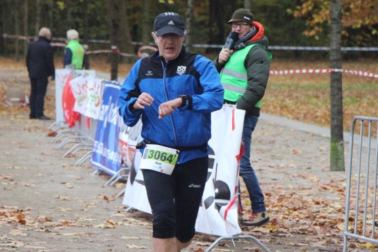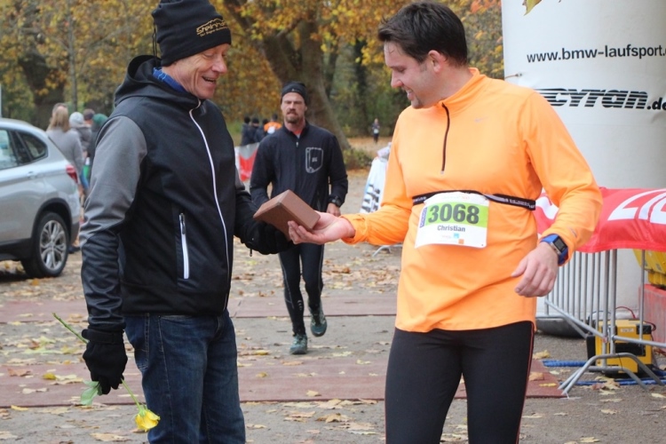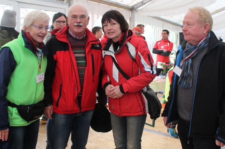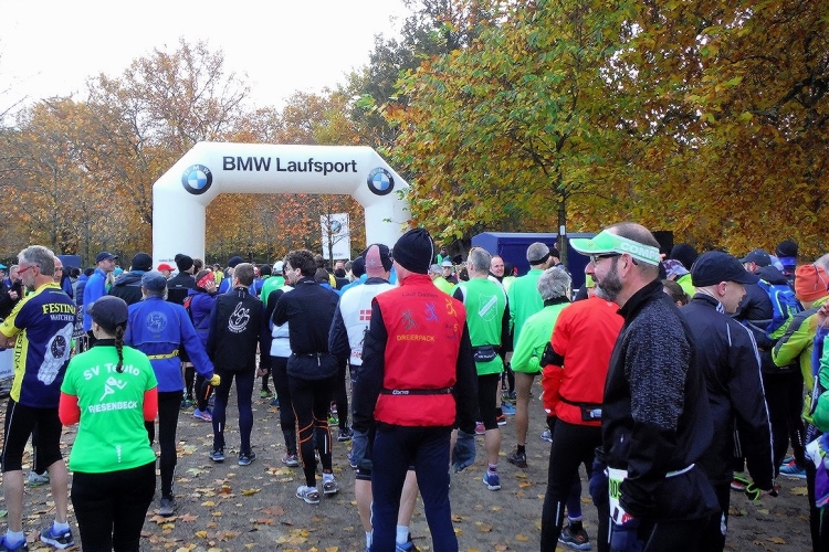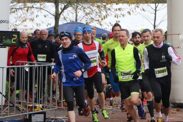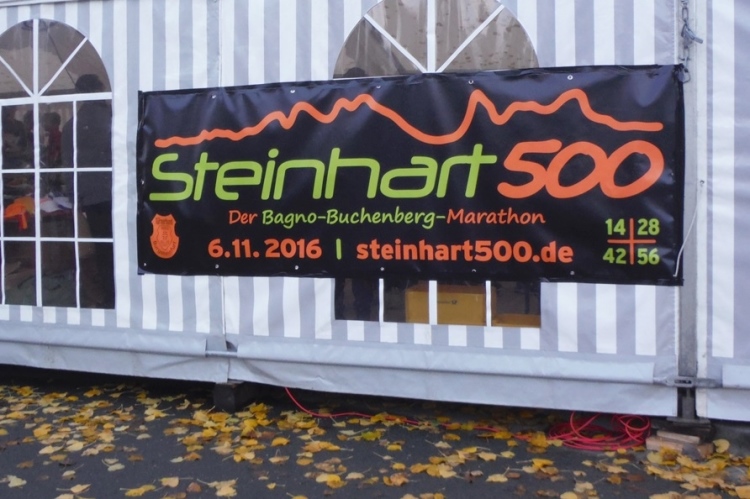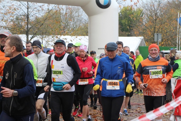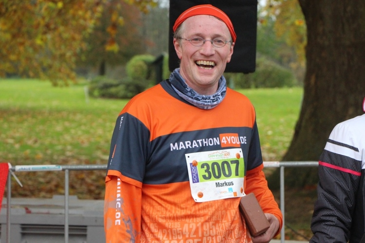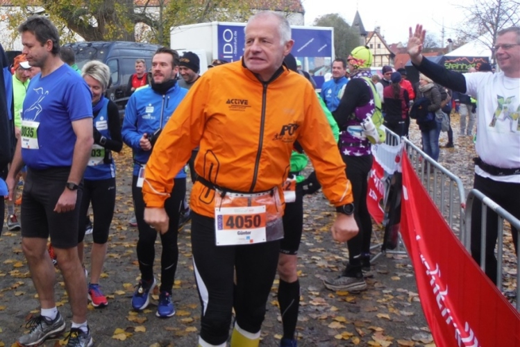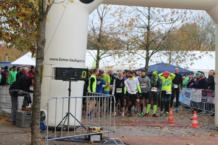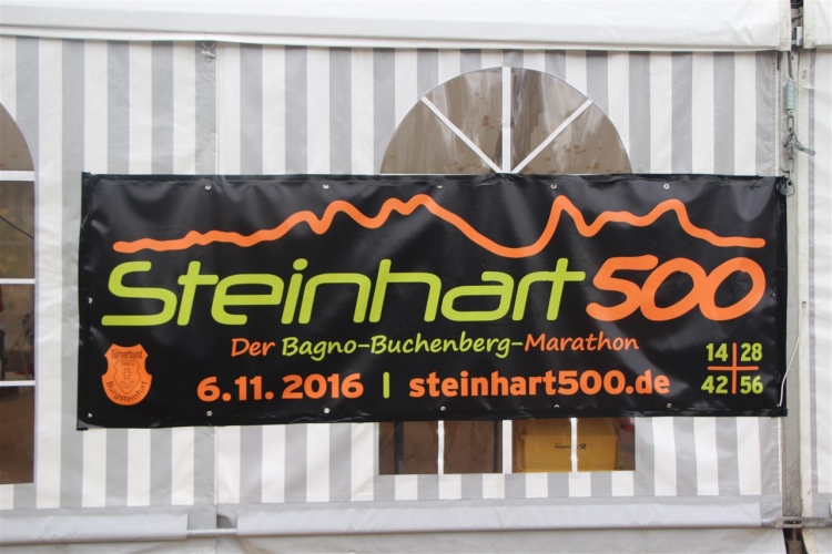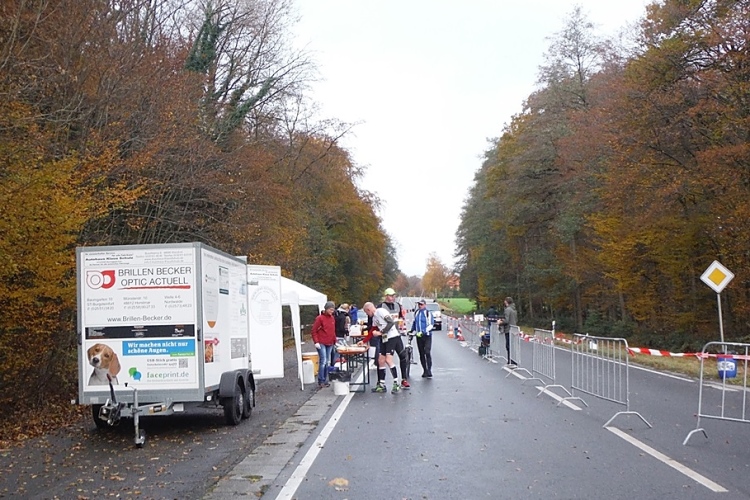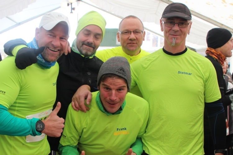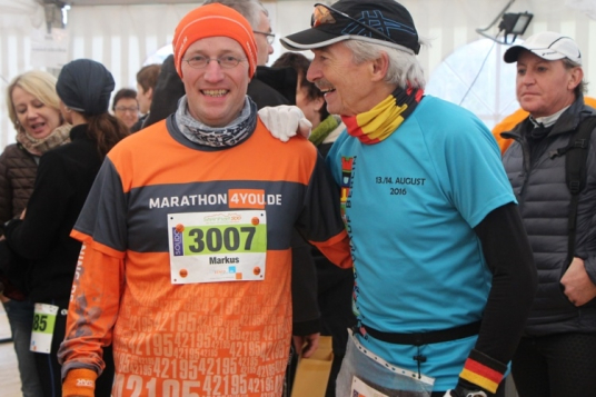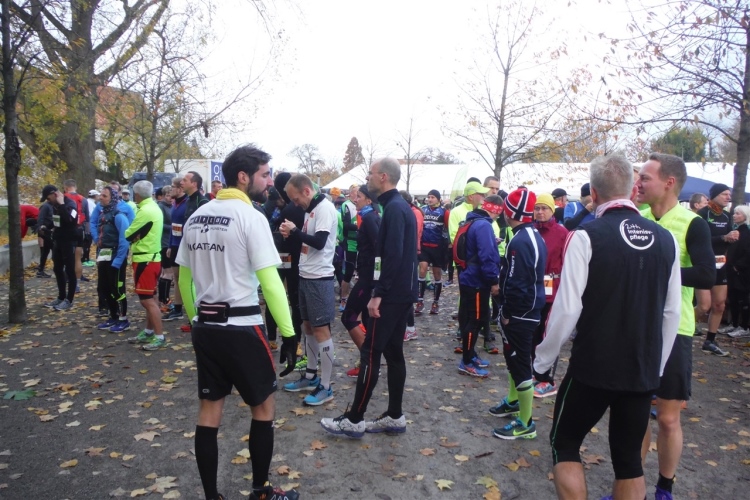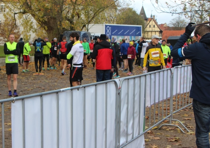 Der Start am Sonntag um 9.30 Uhr gibt mir Gelegenheit auszuschlafen und üppig zu frühstücken. So erreiche ich gut gestärkt den Startbereich. Die frischen Temperaturen von 5 Grad treiben mich nochmals ins Festzelt. Gut eingeheizt ist hier, weshalb sich das Gros der Starter einfindet. Ich bekomme die Gelegenheit, zahlreiche Bekannte zu begrüßen, wie Gerd, Günter und HaWe. Erst der nahe Start treibt uns ins Freie. Langsam füllt sich der Startbereich. Links stehen schon die Ziegelsteine für die Finisher. Vorher vergreift sich keiner daran. Wäre zu auffällig und zudem zu unhandlich und schwer, diese 42 Kilometer mitzuschleppen. Wie komme ich nur auf solche Ideen?