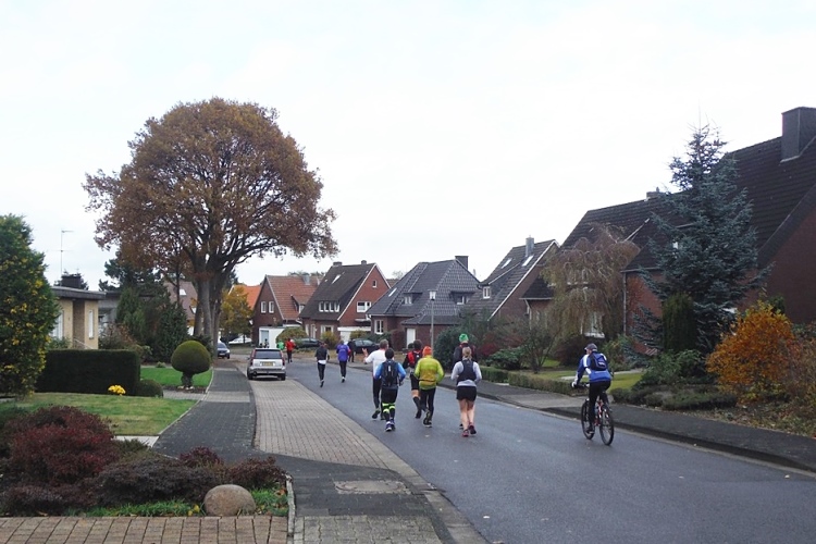 Gemeinsam verlassen wir nach wenigen hundert Metern die Straße. Wir streifen die ersten Ausläufer des Naturschutzgebietes am Buchenberg. Geradeaus könnten wir ihn den Berg sehen, versperrten nicht Bäume die Sicht. Ein Schwenk führt uns bald darauf aus dem Wald heraus und voraus grüßt Borghorst. Zuschauer gibt es hier auch, einer hat seine Tröte ausgepackt und bläst uns den Marsch. Eine tolle Abwechslung. Freundlich angetrieben erreiche ich kurz darauf den zweiten Steinfurter Stadtteil. Ich streife ihn jedoch nur am Rande, denn schon bald führt mich die Strecke hinaus ins typische Münsterland. Zwischen den Ortschaften verteilen sich einzelne Höfe. 6 KM sind geschafft.