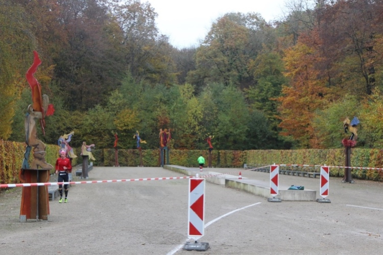 Ich bin mit Ralf für die nächsten Kilometer zusammen. Bei KM 10 erwartet uns ein Begegnungsstück, damit die Runde auf die erforderlichen 14 Kilometer kommt. Wäre weiter nicht schlimm, wenn nicht einige zusätzliche Höhenmeter damit verbunden wären. Als Ausgleich bekomme ich Gelegenheit zur Standortbestimmung. Klaus und HaWe liegen etwas zurück. Aber das interessiert mich heute egentlich wenig, denn ich bin ja zeitlos unterwegs. Zudem bin ich ja in intensivem Gespräch mit Ralf. Fast unbemerkt erreiche ich das Bagno mit seiner Konzerthalle. Moderne Kunst füllt den Platz davor. Links liegt der Bagnosee, dessen Ufer ich anschließend folge.