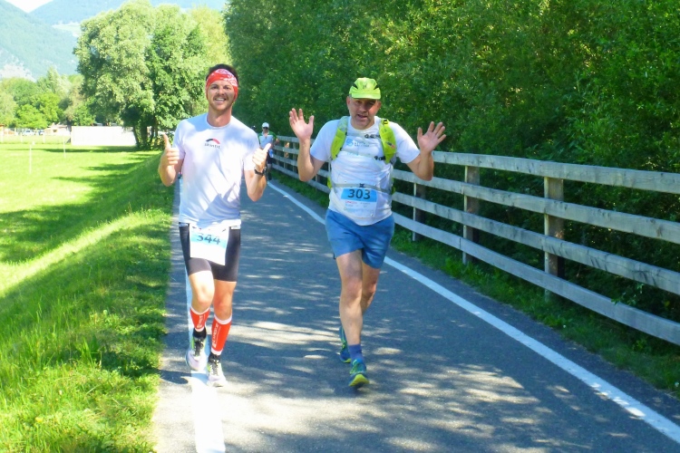 Für uns steht heute zunächst eine 16-km-Runde durch den Talboden an, gefolgt von 19 km Berglauf über unterschiedliche Wege und 7 km auf der weltberühmten Stilfserjoch-Passstraße. Die Dame an der Hotelrezeption überraschte uns gestern mit der Frage, welchen Zeitrahmen wir dafür eingeplant hätten. Eigentlich sind wir ja Genussläufer, aber wir haben dann auf etwa sechs Stunden getippt. Und so sind wir jetzt mit den 5:45-h-Pacern unterwegs.