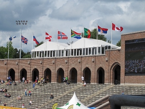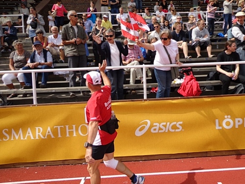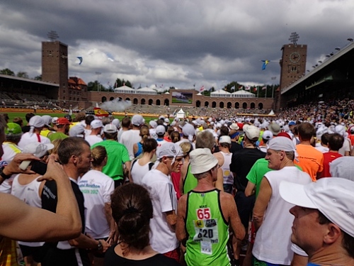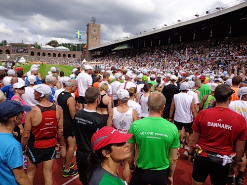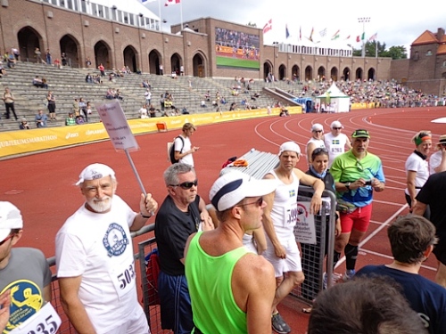Eine friedvolle Atmosphäre auf der von der Sonne beschienenen Wiese hinter dem restaurierten Olympiastadion. Läuferinnen und Läufer aus 50 Nationen tummelten sich hier, ein Japaner und eine US-Amerikanerin als Enkelkinder von olympischen Marathonläufern aus 1912. Von mehreren Teilnehmernationen gab es Laufleiberl mit Nationalflagge drauf zu kaufen, den Originalleiberln nachempfunden. Dann eine Besichtigung im Stadion, wo morgen Start und Ziel sein würden. Auch die Königsloge mit Baldachin sieht genau so aus, wie auf den alten Fotos. Die Vorfreude stieg.