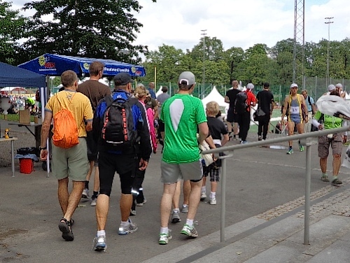 Beim Stadion herrscht schon Trubel. Überall wehen Flaggen und es ist sonnig, leicht windig, angenehm kühl. Die Leute sind gut gelaunt, viele davon in alten Gewändern, ein echtes Erlebnis. Ich gehe voran zur Kleiderbeutelabgabe hinter dem Stadion, den Beutel über der linken Schulter, den Fotoapparat in der rechten Hand. Der Gehweg ist mit Absperrgittern vom Radweg und der Fahrbahn getrennt. Ein Däne im Laufdress mit aufgezwirbeltem Schnurrbart kommt uns entgegen, sieht echt gut aus. Ich will Evi drauf aufmerksam machen, drehe mich um, bleibe mit dem rechten Knöchel im herausragenden Fuß eines Absperrgitters hängen und knalle mit der linken Schulter und dem Gesicht auf das Betonpflaster des Gehwegs. Schwer erschüttert stehe ich auf.
