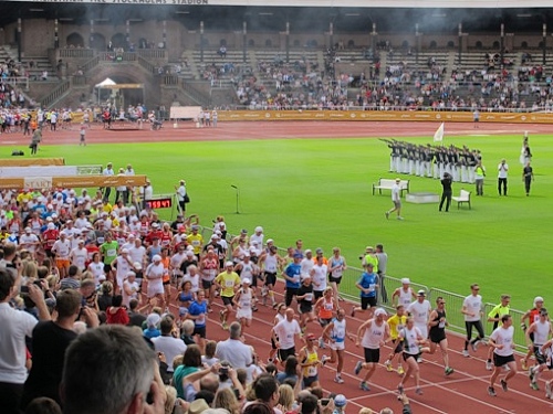 Wenn man sich so lange auf ein Rennen vorbereitet hat, dann will man es auch durchziehen, wenn es irgendwie zu verantworten ist. Ich verziehe mich Richtung Stadion. Startnummern 2501 – 5000 sind nun dran. Ein Ordner macht uns darauf aufmerksam, dass man in 100 Jahren vielleicht unsere Fotos ansehen wird und ob wir deshalb eh gut geschminkt wären?