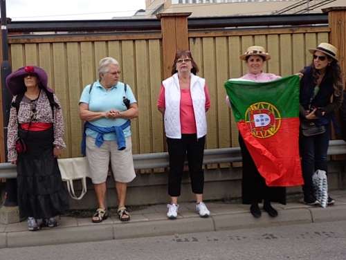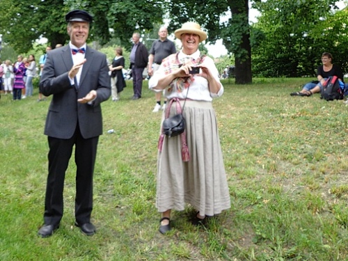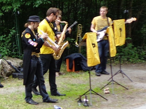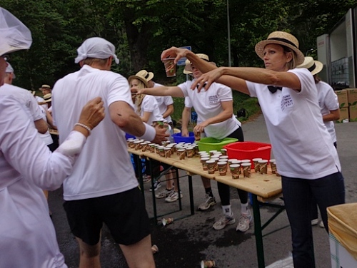 Rauf zu km6, da beginnt es leicht zu regnen, etwa 15min lang. Die Musikgruppe ist unter einem Baldachin, hat aber leider gerade Pause. Und wieder steil hinunter, auf der Ideallinie muss ich einer Dusche ausweichen, bald geht es wieder steil aufwärts. Der Veranstalter hat nicht übertrieben, als er vor dem Streckenprofil gewarnt hat. Ich muss an die Olympioniken von 1912 denken, die hatten Sonnenschein und 31 Grad!