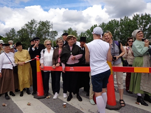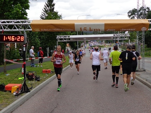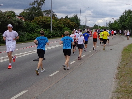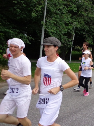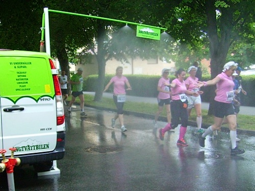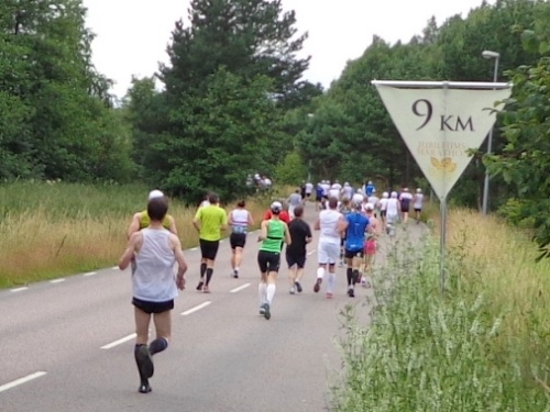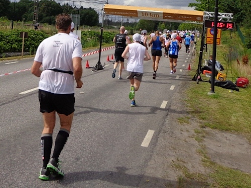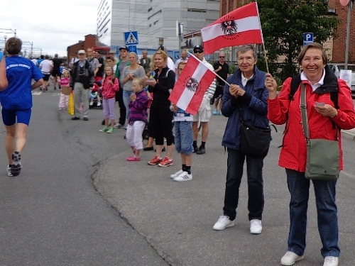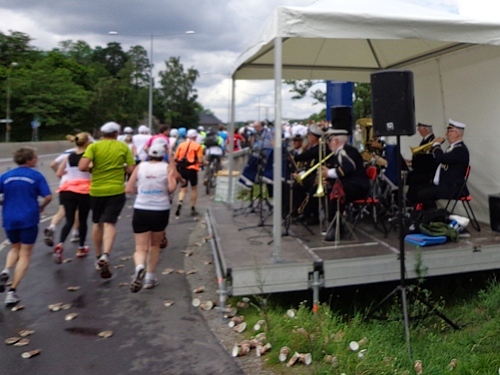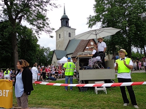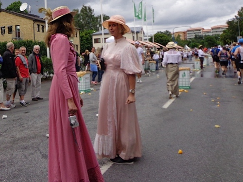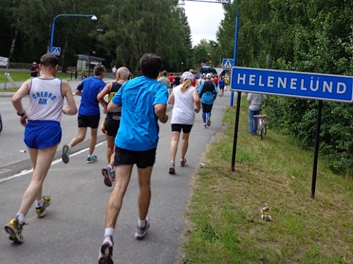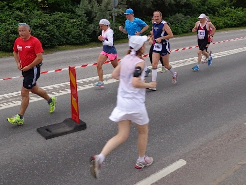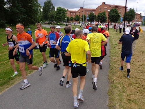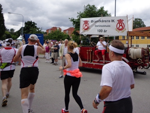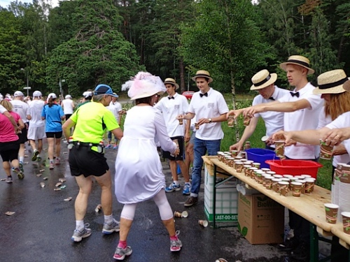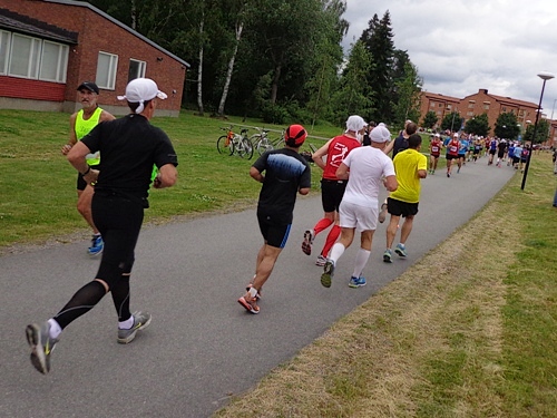 Nach km14 am Bahnhof von Sollentuna ist wieder viel los. Relativ viele der Zuschauer sind kostümiert an der großen Labestelle für beide Richtungen. Die Strecke führt entlang der Eisenbahn, die Züge brausen mit geschätzten 200km/h in wenigen Metern Entfernung an uns vorbei. Nun den Hügel rauf, noch 5km bis zur Wende.