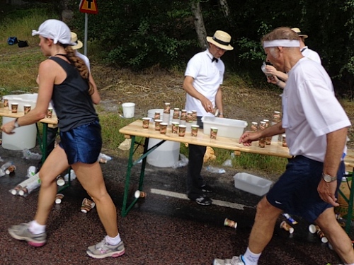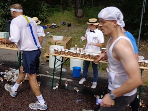 Bei der nächsten Labestelle gibt es zum Wasser auch Iso, Zitronen- und Orangespalten. Wir haben großes Glück mit dem Wetter. Nun ist es bewölkt. Bei km5