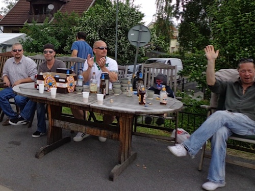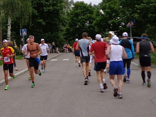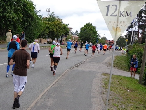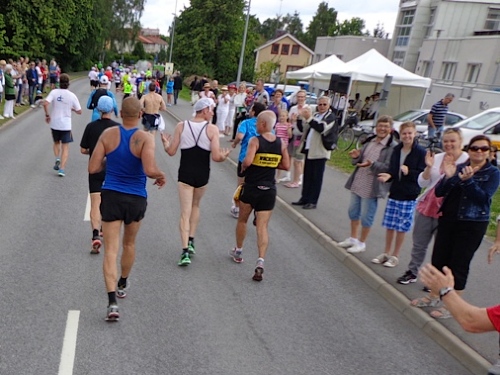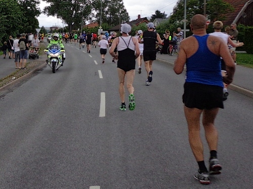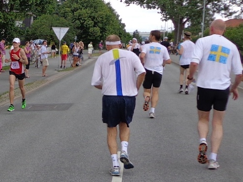 Der Marathon von 1912 war 40,075km lang. Er verlief zur Kirche von Sollentuna und denselben Weg wieder zurück ins Olympiastadion. Die gesamte Strecke ist also hin und zurück zu laufen, ein einziger Gegenverkehrsbereich. Nach km13 ist es soweit. Zwei Motorräder mit Blaulicht kündigen den Führenden an. Er ist 10min vor mir gestartet und jetzt bei km27! Dann eine Lücke, bis der zweite, dann auch der dritte kommt. Hier sitzt eine gesellige Runde, die jeden, der Augenkontakt aufnimmt, auf ein Glas Bier einlädt. Freibier in Skandinavien! Wenn das keine Sensation ist!