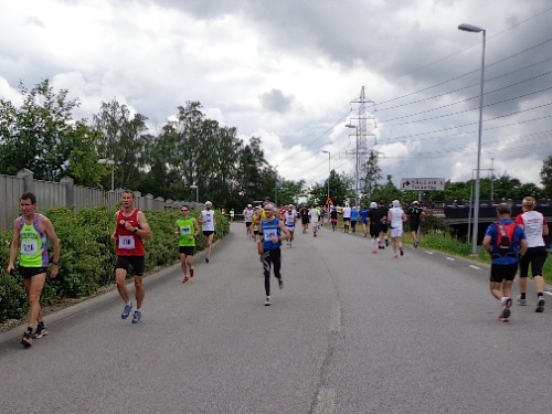 Es geht auch gleich mit einer leichten Steigung los, rein in bewohntes Gebiet. Wir kommen an die Eisenbahn, als die Strecke steil abfällt. Schon nach 2km gibt es erstmals „Vatten“ zu trinken. Auf Nebenstraßen, durch Siedlungen und Wälder geht es. Ab und zu geht es an der Autobahn Richtung Flughafen entlang. Diese Autobahn ist wohl ein Hauptgrund, warum wir „nur“ zu 99% auf der Originalstrecke laufen.