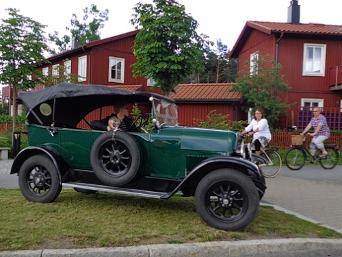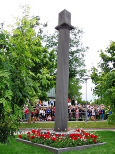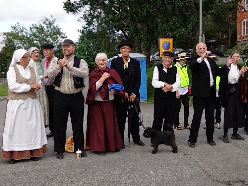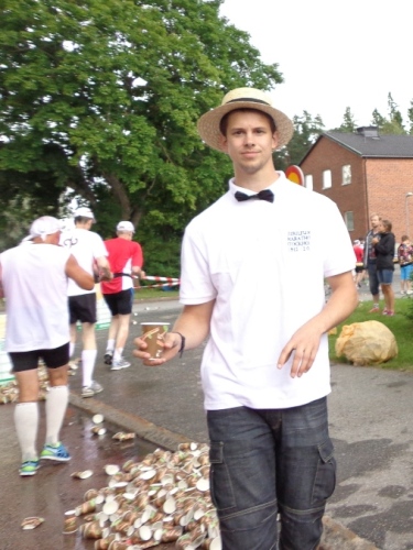 Km20 nach 2h05. Hinter den Bäumen kann man die Kirche von Sollentuna erkennen, davor wird eine kleine Schleife links herum gelaufen. Um die 6m hohe Säule aus schwarzem Granit, beschriftet mit „Vändpunkten“, „1912“ und „Marathon“. Die Granitsäule wurde vor kurzem übersiedelt, um diesen Streckenabschnitt für die vielen Läufer besser laufbar zu machen. Der Originalwendepunkt war 100m nördlich davon. Aber das kümmert jetzt keinen. Hier ist richtig was los, es gibt Live-Musik und einen Platzsprecher, der für Stimmung sorgt. Als ich vorbeikomme, interviewt er gerade einen kostümierten Brasilianer.