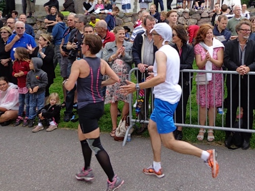 Ich komme mit einer Läuferin ins Gespräch. Sie hat vor, nach 40,075km zu finishen, wird das aber erst bei km35 klären, da trifft sie ihren Mann. Das wäre heute ihr 46. Marathon, aber so gequält habe sie sich noch nie. Das deckt sich ziemlich genau mit der Meinung all jener, die sich mir gegenüber zu dieser Strecke geäußert haben. Das zackige Streckenprofil ließ keinen Rhythmus aufkommen, die Anstiege und Abstiege waren meist relativ steil, wenn auch nicht besonders lange.