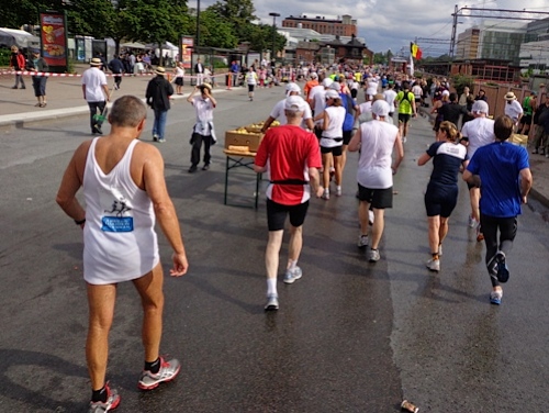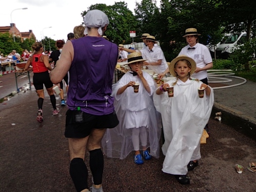 Km25 nach 2h37. Nun steht uns ein Anstieg bevor, ehe es zum Bahnhof von Sollentuna runter geht. Km26. Hier gibt es erstmals, und ich glaube auch einmalig, Bananen. Duschen kann man auch und aus Wasserwannen mit der Mütze Wasser schöpfen. Die Sonne ist wieder durchgekommen, die Schlachtenbummler machen gute Stimmung. Ich kann belgische, dänische, kanadische und österreichische Fahnen erkennen. Laufreisen.de ist da und interAir macht mit einem großen Wimpel auf sich aufmerksam.
