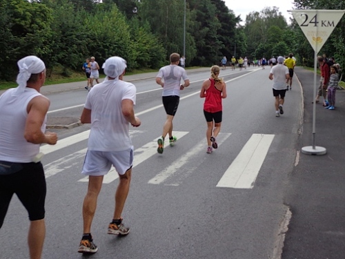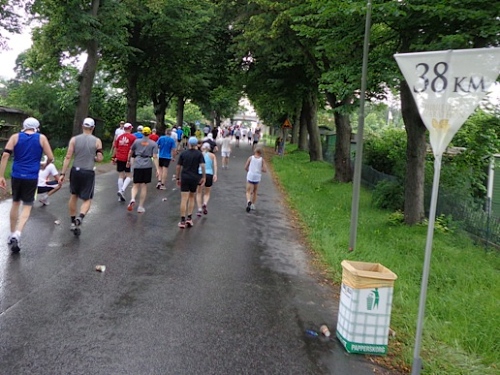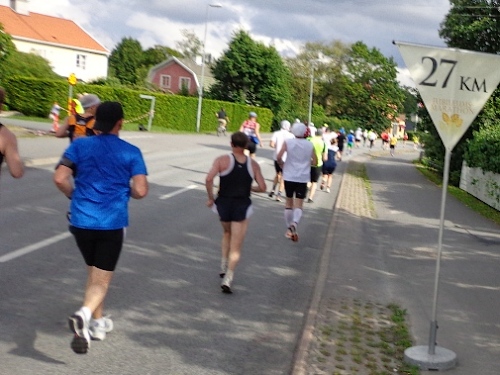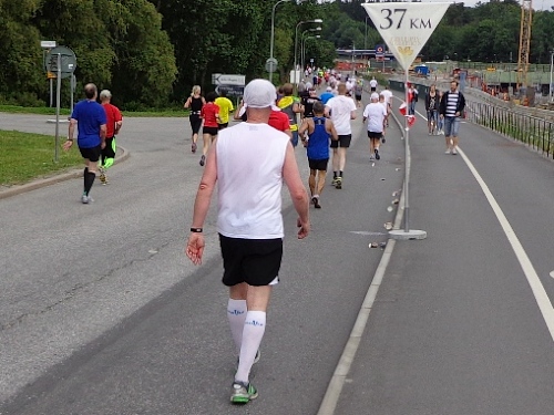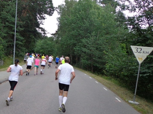 Der Gegenverkehr ist eingeschlafen, da kommt keiner mehr. Bei km27 kommt Klaus aus Dänemark auf mich zu. Wir kennen uns flüchtig aus Bratislava, er war vor zwei Wochen beim Maribor-Marathon. Das Gespräch verkürzt mir die Zeit etwas. Mittlerweile sind die Zuschauer etwas mürbe geworden, auch weniger. Nur mehr vereinzelt erschallt das in den letzten Stunden hundertfach gehörte „Heja, heja!“.