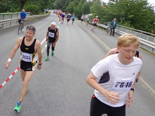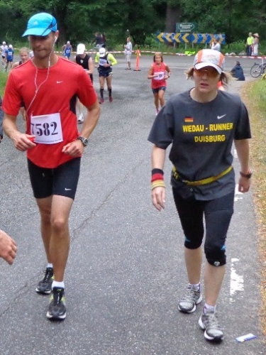So, es geht zurück. Der Gegenverkehr ist um nichts weniger geworden. Schließlich sind die Läufer innerhalb von 40min gestartet. Da zieht sich das Läuferfeld, was auch gut ist. Es ist so schon eng genug. Bei km22 wieder unter der Eisenbahn durch. Bei der Labe km23 gibt es kurzfristig getrennte Richtungslaufbahnen. Beim nun folgenden Hakenschlagen über die Autobahn ist es nun nicht mehr so bedrohlich eng, die entgegenkommenden Läufer sind deutlich weniger geworden. Der Damenchor singt auch wieder, als ich zum zweiten Mal daran vorbei komme.