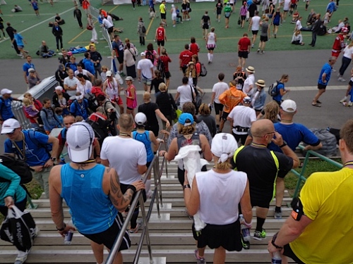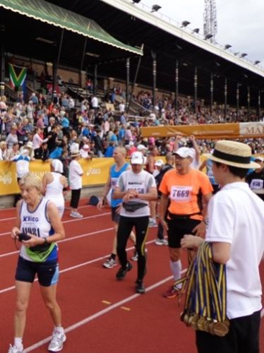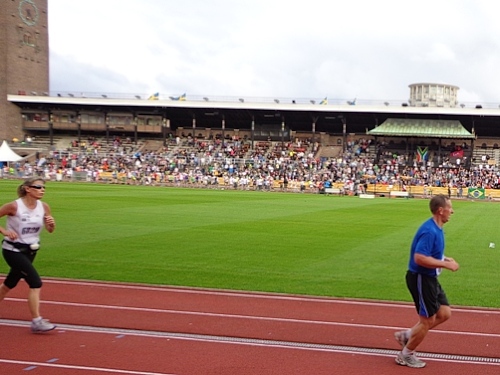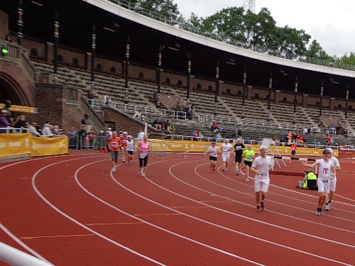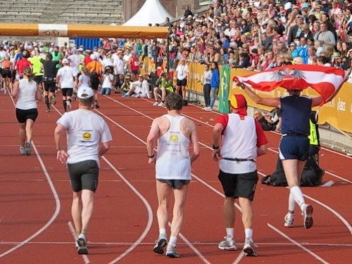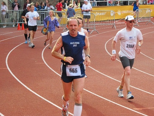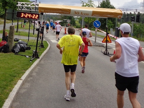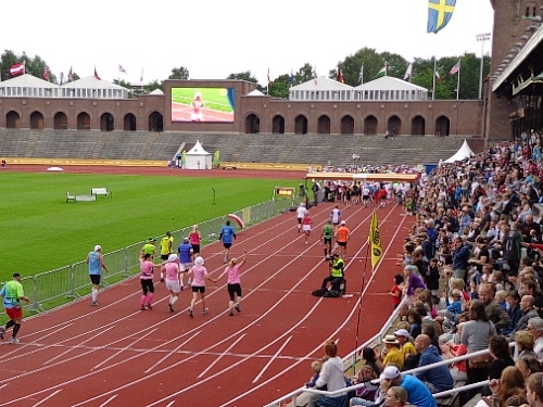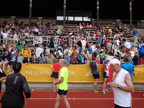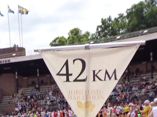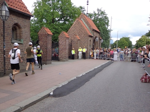 Km35 nach 3h46. Wieder bin in Berghamsra, von den „Heja, heja“-Rufern vor gut zwei Stunden sind nicht mehr viele übrig geblieben. Nun geht es wieder über eine Autobahn, der wir 2km folgen. Dann vorbei an einer Universität und in ein Wäldchen. Am Beginn des letzten steilen Anstiegs bei km38 gibt es noch mal eine Stärkung. Etwa 1km vor dem Stadion nimmt das Zuschauerinteresse wieder zu. Wieder auf den Valhallavägen wird auch meine Stimmung wieder besser. Rechts an den Absperrgittern stehen die Leute und rufen „Heja, heja, heja!“ Davon werde ich heute Nacht träumen! Die Gehsteigkante ins Stadion ist provisorisch überasphaltiert, damit nur ja keiner stolpert. Rein ins Stadion! Hurra!