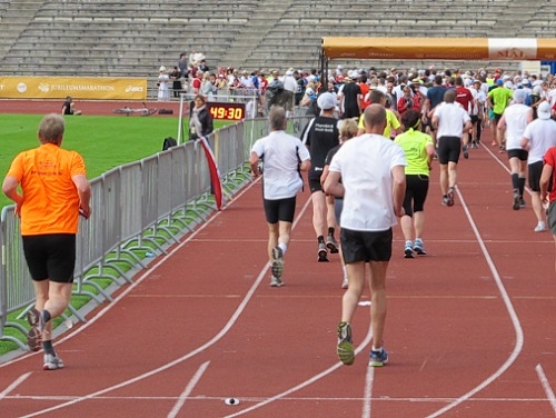 Hier kann man sich entscheiden, ob man die damalige Marathondistanz von 40,075km läuft oder die seit 1920 gültigen 42,195km macht. Meine Entscheidung ist längst gefallen. Ich laufe links gegen die eigentliche Laufrichtung im Stadion und bekomme bei 40,075km eine Zwischenzeit. Die, die jetzt auf den Innenbahnen mir entgegenlaufen, sind ziemlich genau 2km vor mir. Ich verlasse am Ende der Geraden wieder das Stadion, da kommt mir Günther entgegen. Mit dem habe ich hier nicht gerechnet. Ich meinte, der wäre längst im Ziel.