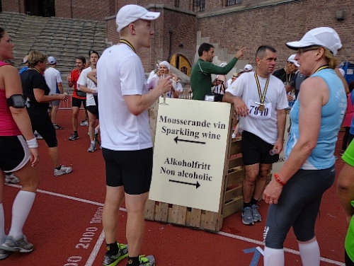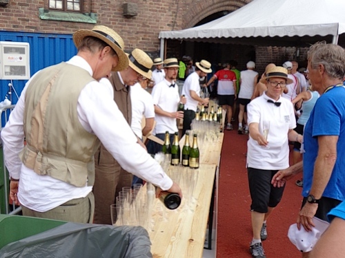 Nun bekomme ich meine Kamera auch wieder in den Griff und mache Fotos und lasse mich mit geschwollener Backe knipsen. Vor dem Ausgang gibt es Sekt für alle in stilvollen Plastikkelchen. Champagner wie für die Finisher anno 1912 wäre dann doch zu teuer gewesen.
