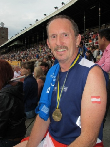 Schöne Erinnerungsmedaillen haben sie hier: Am blau-gelben Band zeigt sie auf der einen Seite das Olympiastadion, auf der anderen ein Bild vom Olympiasieger von 1912, Kennedy Kane McArthur aus Südafrika.