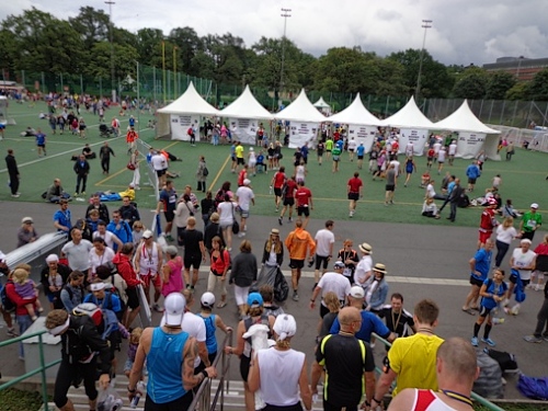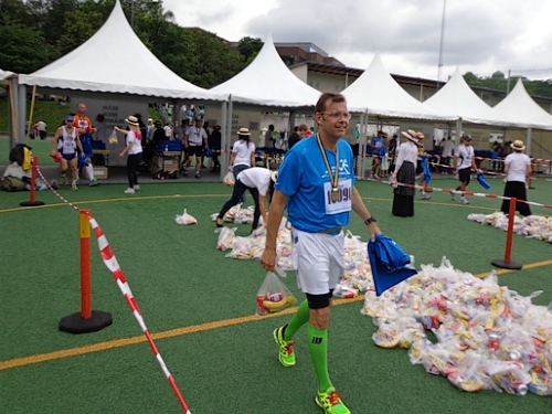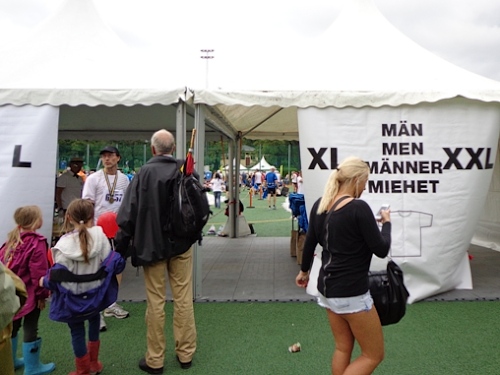 Bevor man zum abgegebenen Kleiderbeutel gelangt, wird man noch zu seiner Finisher-Shirt-Größe geschleust und erhält zum Shirt einen Beutel mit Getränken und etwas zu essen. Kaffee und Kuchen gibt es auch gratis.