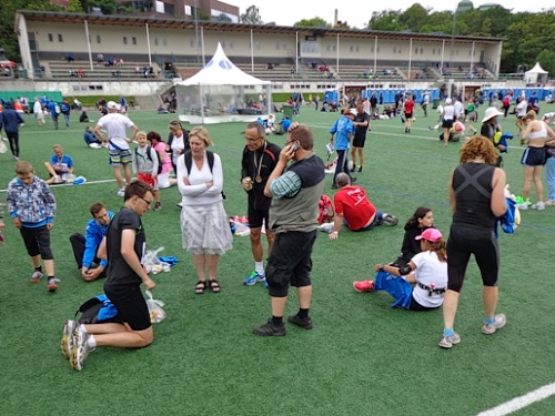 Kurz vor dem Stadion überhole ich zwei nebeneinander Laufende und bekomme einen Schlag auf meine rechte Hand. Dabei verändert sich die Kameraeinstellung und kann nicht mehr knipsen. Zwar steht was am Display, aber ohne Brille habe ich keine Chance, diese kleine Schrift zu lesen. Außerdem habe ich die Kamera erst seit 4 Tagen und bin noch nicht vertraut damit. Ich drücke rum und will es nicht wahr haben. Kein Bild vom Zieleinlauf, ist so!