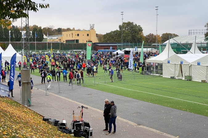 Es ist bedeckt bei 14 Grad, aber ein kühler Wind weht. Die Kleiderfrage gestaltet sich also schwierig. Regen könnte es auch geben. Taschenabgabe auf dem Spielfeld. Apropos: Wer es am Freitag nicht mehr zur Startnummernabholung geschafft hat, der hat hier die Möglichkeit, doch noch seine Unterlagen zu bekommen.