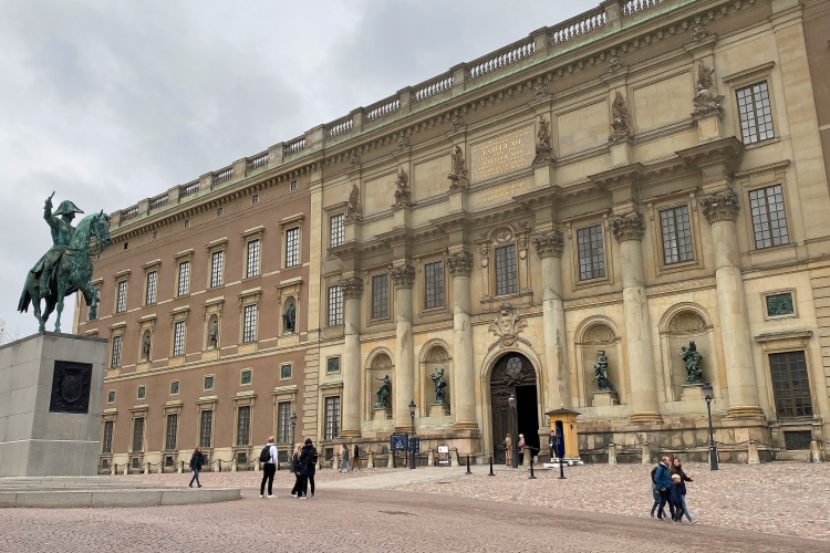 Wir erreichen Gamla Stan. Wer dabei an etwas gammeliges denkt, liegt gar nicht so falsch, denn „gamla“ heißt „alt“. Es handelt sich um die Insel der Altstadt. Und da Stockholm nur einmal von sowjetischen Verbänden bombardiert wurde und viele alte Bauwerke erhalten blieben, ist es hier ganz urig. Viele Gässchen, Kopfsteinpflaster, zwei wichtige Kirchen, Kneipen und Andenkenläden. Rechts der Palast erinnert mich irgendwie an Italien. Es ist der zwischen 1697 und 1760 entstanden schwedische Königspalast. Baumeister war ein gewisser Nicodemus Tessin d. J. Hier befinden sich die Büros der Königsfamilie, die selbst seit 1982 auf Schloss Drottningholm residiert, und repräsentative Räumlichkeiten für Staatsbesuche, Audienzen und Ehrungen.