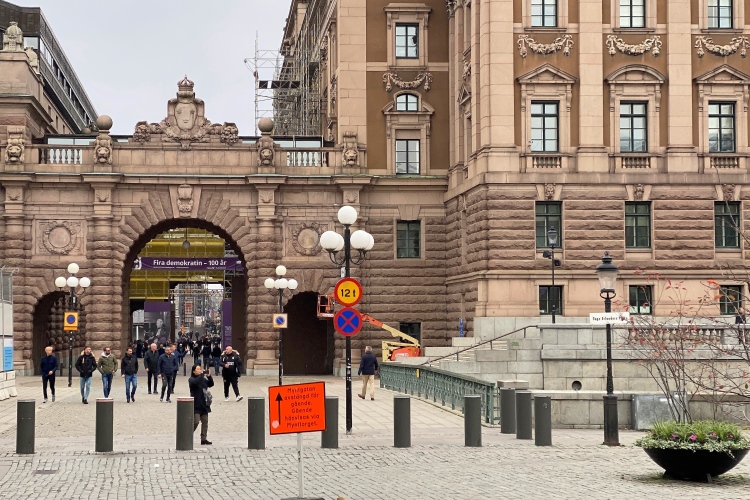 Links der Hauptbahnhof. Viele Schnellstraßen, Zugstrecken. Wir unten durch. Kaffee würde hier angeboten. Kilometer 10 ist erreicht. Zeitnahme alle 5 Km. Über die nächste Brücke, Vasabron. Links von uns der schwedische Riksdag, das zwischen 1897 und 1905 entstandene Parlamentsgebäude, welches ursprünglich neben dem Reichstag auch die Reichsbank beherbergte. Es nimmt die gesamte Insel nebenan ein.