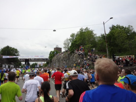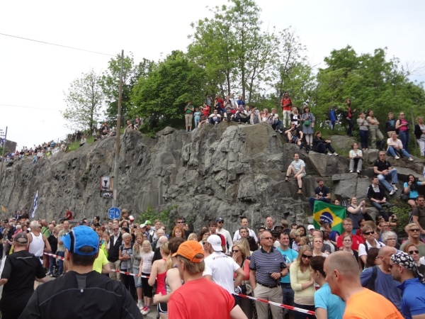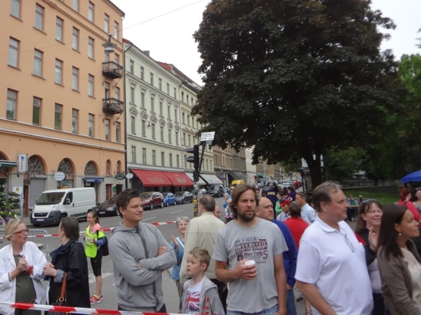 Km 8 - Keinen Meter müssen wir ohne Unterstützung auskommen. Einige Zuschauer haben es sich mit Picknickstühlen bequem gemacht. Gymnasiasten haben ihr Studenten (Abschluss-Fest) an die Strecke verlegt und prosten uns nun fröhlich zu. Viele stehen samt Kind und Kegel trommelnd, rasselnd oder mit Vuvuzela-Tröten tutend am Strassenrand. Ein begeisterteres Publikum haben wir noch nie erlebt! Wir sehen das Ende der langen Gerade und die Ameisenstrasse auf der Brücke Västerbron. Mit einer Linkskurve beginnt der berüchtigte Anstieg zur Westbrücke. Noch intensiverer Zuspruch lässt uns die Rampe erstaunlich leicht bewältigen.