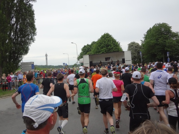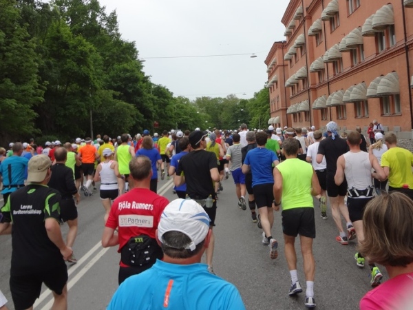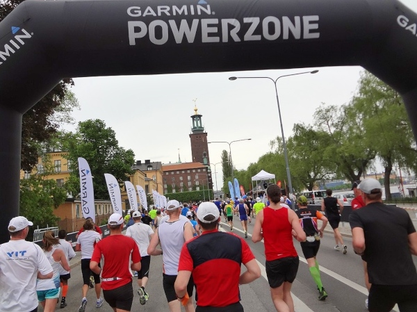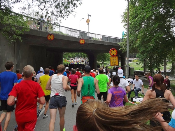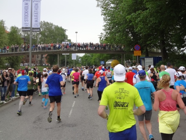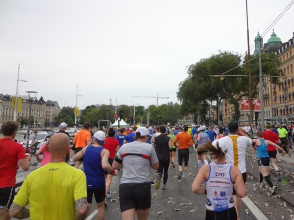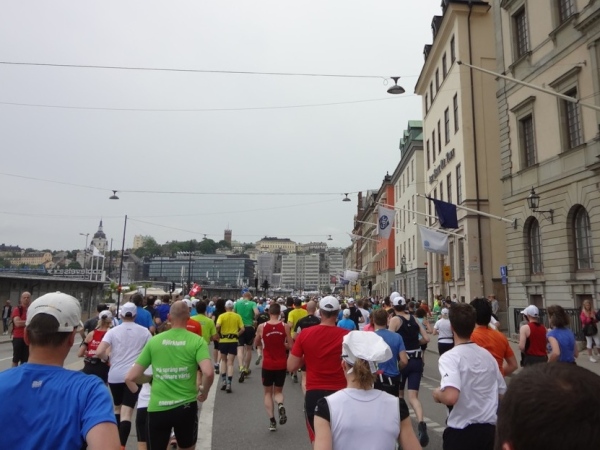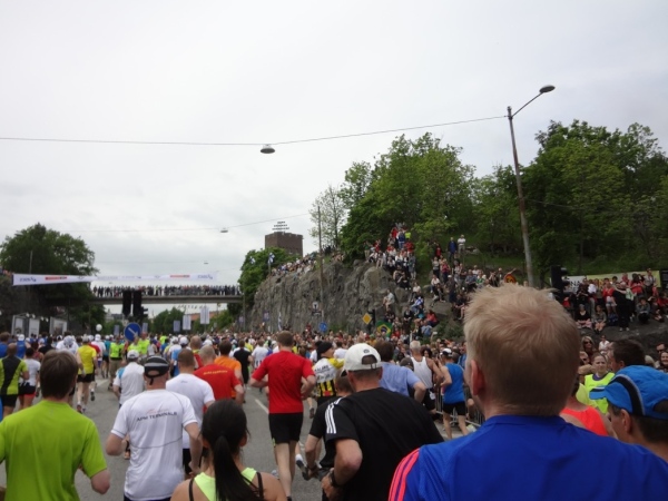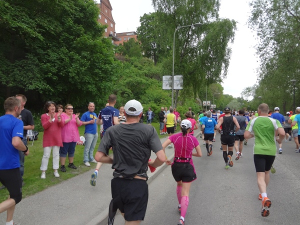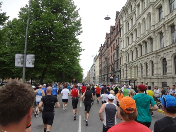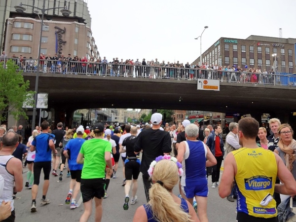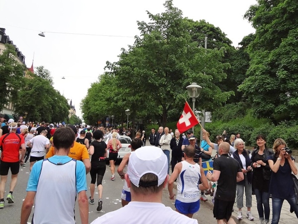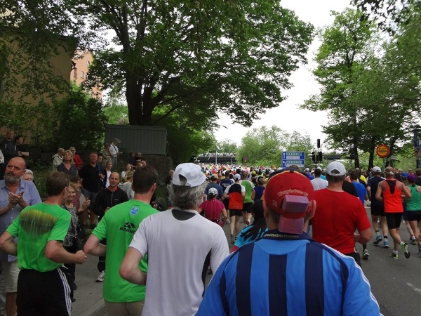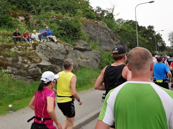 Km 1 - Pünktlich um 12 Uhr fällt der Startschuss. Die Startblöcke A, B, C und D gehen gleichzeitig auf die lange Fussreise. Wir stehen im D. Erst spazieren wir, fallen in lockeren Trab, nach zwei Minuten erreichen wir die Startlinie rennend, können unsere Stoppuhren starten und kommen im dichten Läuferstrom sofort erstaunlich gut voran. Das Publikum scheut keine Mühe, uns Glück zum Marathon-Vorhaben zu wünschen. „Lycka till“ und „heja, heja“ ruft man uns aus dichten Reihen am Strassenrand, und von einer Brücke herunter zu. Einige Zuschauer sind auf die Felsen am Strassenrand geklettert. Es ist unmöglich nicht von Laufeuphorie gepackt zu werden.