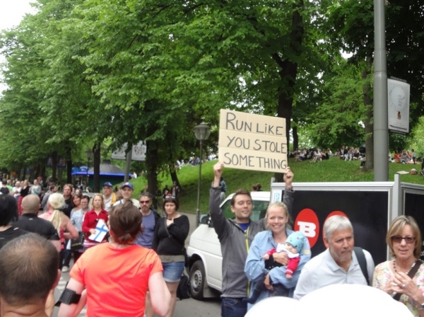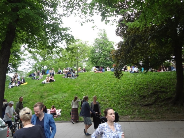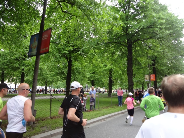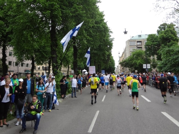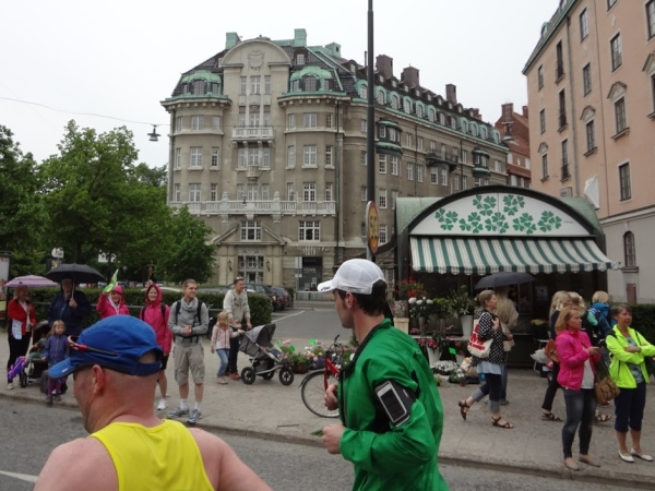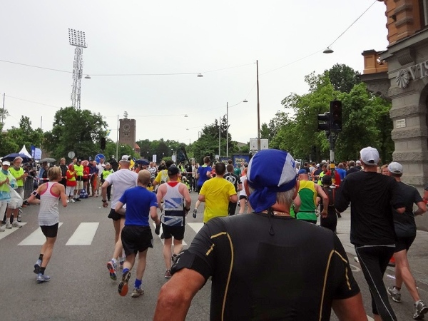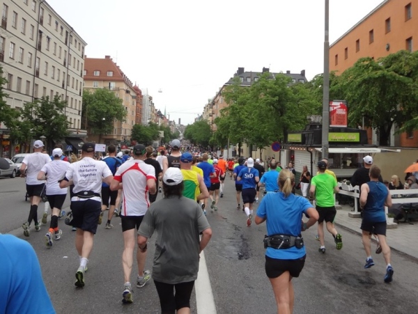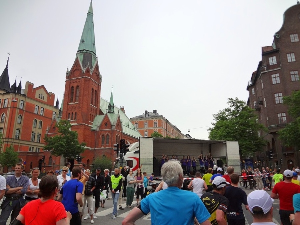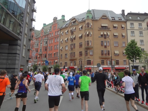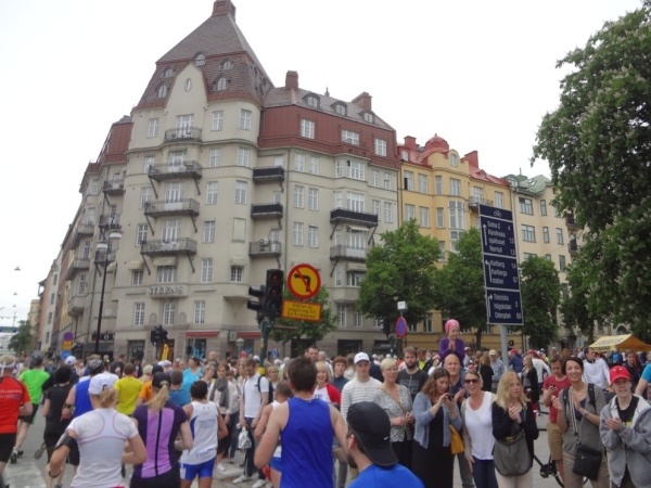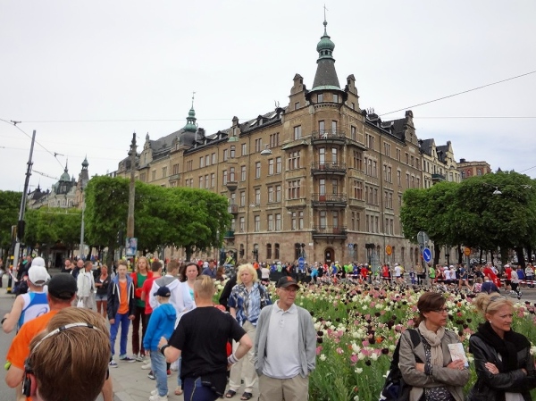 Auf der Torsgatan erklimmen wir den langgezogenen Hügel nach Vasastan. Wien und Paris dienten als Vorbilder für das rechtwinklige Strassennetz und die fünf- bis sechsstöckigen Mehrfamilienhäuser dieses Stadtteils. Beim Vasapark kann man seine Batterien mit Traubenzucker aufladen. Viele greifen daneben, die Strasse ist weiss getupft. Im Park haben sich die begeisterten Fans besonders zahlreich stationiert. Der Marathon ist ein gewaltiges Volksfest. Und die Schweden geniessen ein solches gerne beim Picknick im Park.