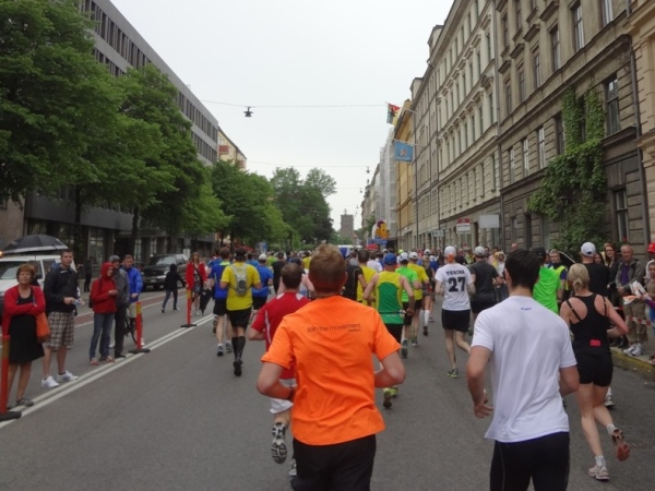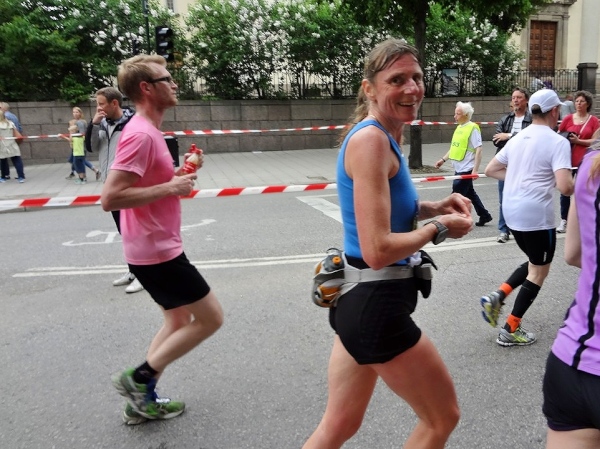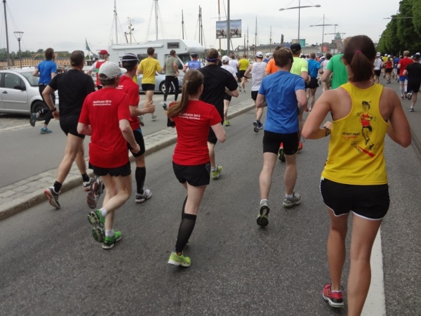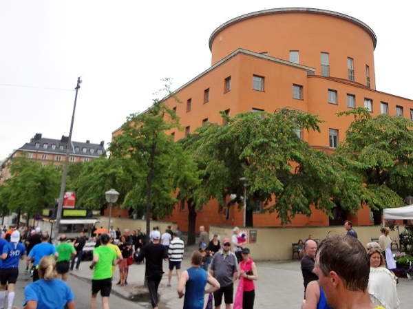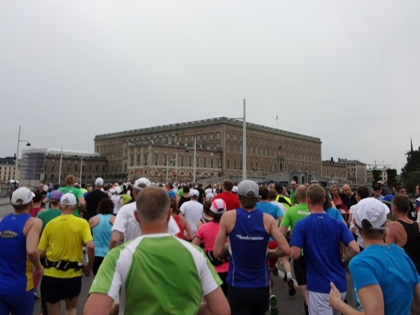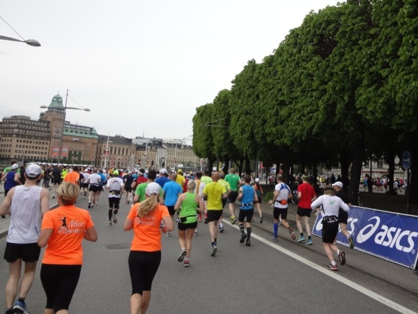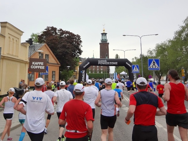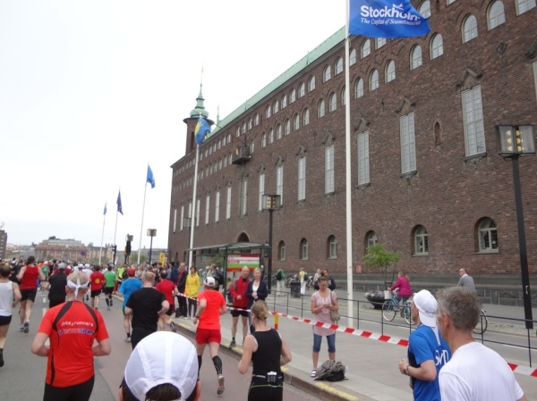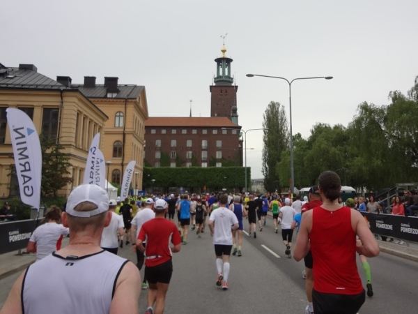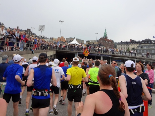 Es zieht sich bis zum roten Backsteinbau des Stadshuset. Weltberühmt ist das Stockholmer Rathaus durch die Nobelfestlichkeiten. Für unser Wohl ist auch gut gesorgt. Zusätzlich zu den 16 Verpflegungsposten, an denen Wasser und Sportgetränke angeboten werden, gibt es Energie-Stationen mit wechselndem Angebot. Vor dem Stadshuset wird Kaffee ausgeschenkt. Über die Stadshusbron verlassen wir Kungsholmen. Die Unterführung zur Insel Norrmalm ist der tiefste Punkt der Strecke.