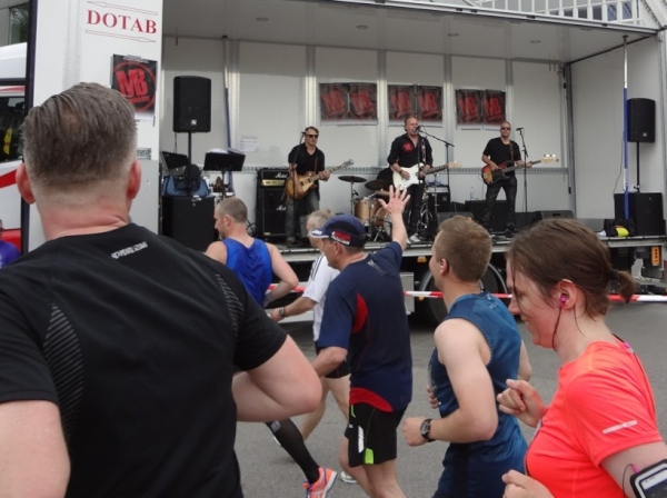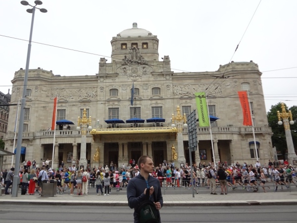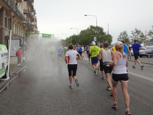 Km 11 bis 12 - Bis zum Stadshuset erwartet uns auf Norr Mälarstrand eine zweite lange Gerade. Am Strassenrand und auf jeder Brücke hat es unglaublich viele Zuschauer. Sie geben ihr Bestes und wir sind dankbar, denn wir müssen uns jetzt gegen den Wind stemmen. Der erfrischende Luftstrom ist aber willkommen. Ich lasse keine Dusche aus. In regelmässigen Abständen stehen Ångtvättbilar (Strassenreinigungsfahrzeuge), welche uns mit wohltuendem Sprühnebel erfrischen.